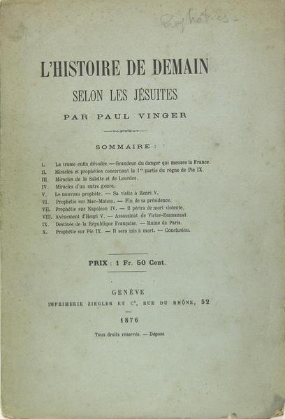 Imprimerie Ziegler et Cie Genève, 1876. plaquette In/8 broché, 117 pages. Exemplaire non coupé La trame enfin dévoilée, grandeur du danger qui menace la France - Miracles et prophéties concernant la 1 ère partie du règle de Pie IX - Miracles de la Salette et de Lourdes - Miracles d’un autre genre - Le nouveau prophète, sa visite à Henri V - Prophétie sur Mac-Mahon, fin de sa présidence - Prophétie sur Napoléon IV, il périra de mort violente - Avènement d’Henri V, assassinat de Victor-Emmanuel - Destinée de la République Française, ruine de Paris - Prophétie sur Pie IX, il sera mis à mort, conclusion.