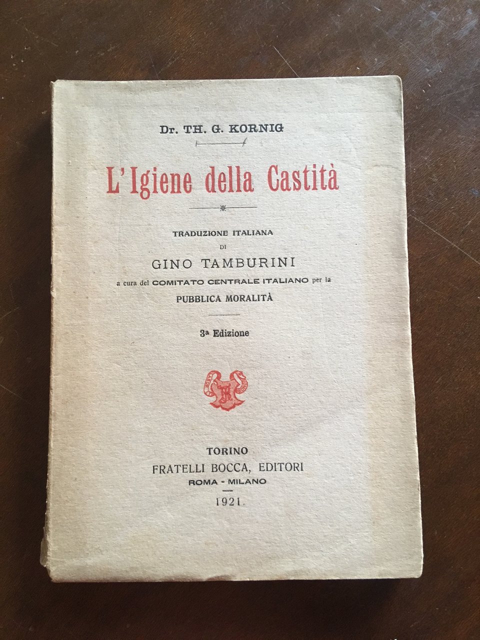 In-8°, pp. 160, brossura editoriale. Traduzione italiana di Gino Tamburini con prefazione del Prof. Carlo Fedeli. A cura del Comitato Centrale Italiano per la Pubblica Moralità