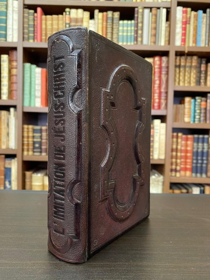 <span style="font-style: normal;">In-8° (cm. 18,8), solida e suggestiva legatura di poco successiva in piena pelle scura con titolo impresso a secco su fregio a sbalzo al dorso, piatti inquadrati da cornici di filetti a secco con al centro losanga geometrica sempre a sbalzo, tagli dorati, risguardi marmorizzati (leggermente stanca); pp. XII 582 in stato molto buono (alcune fioriture, antica firma di possesso al verso del risguardo); con 5 belle tavole fuori testo incise in rame da Pigeot Leroux e Bovinet sui disegni di Horace Vernet, di cui 1 all'antiporta, protette da velina. Celebre opera mistica attribuita a Tommaso da Kempis, qui nella traduzione francese del teologo gesuita Jérôme de Gonnelieu, pubblicata per la prima volta nel 1712 (molti studiosi negarono l'attribuzione: cfr. Patrick MacAuley, </span><i>The Catholic Encyclopedia</i> VI, 1909). Esemplare molto buono. (NO6)