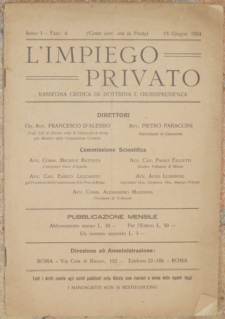 L'IMPIEGO PRIVATO RASSEGNA CRITICA DI DOTTRINA E GIURISPRUDENZA ANNO I - FASC. 4 - 15 GIUGNO 1924