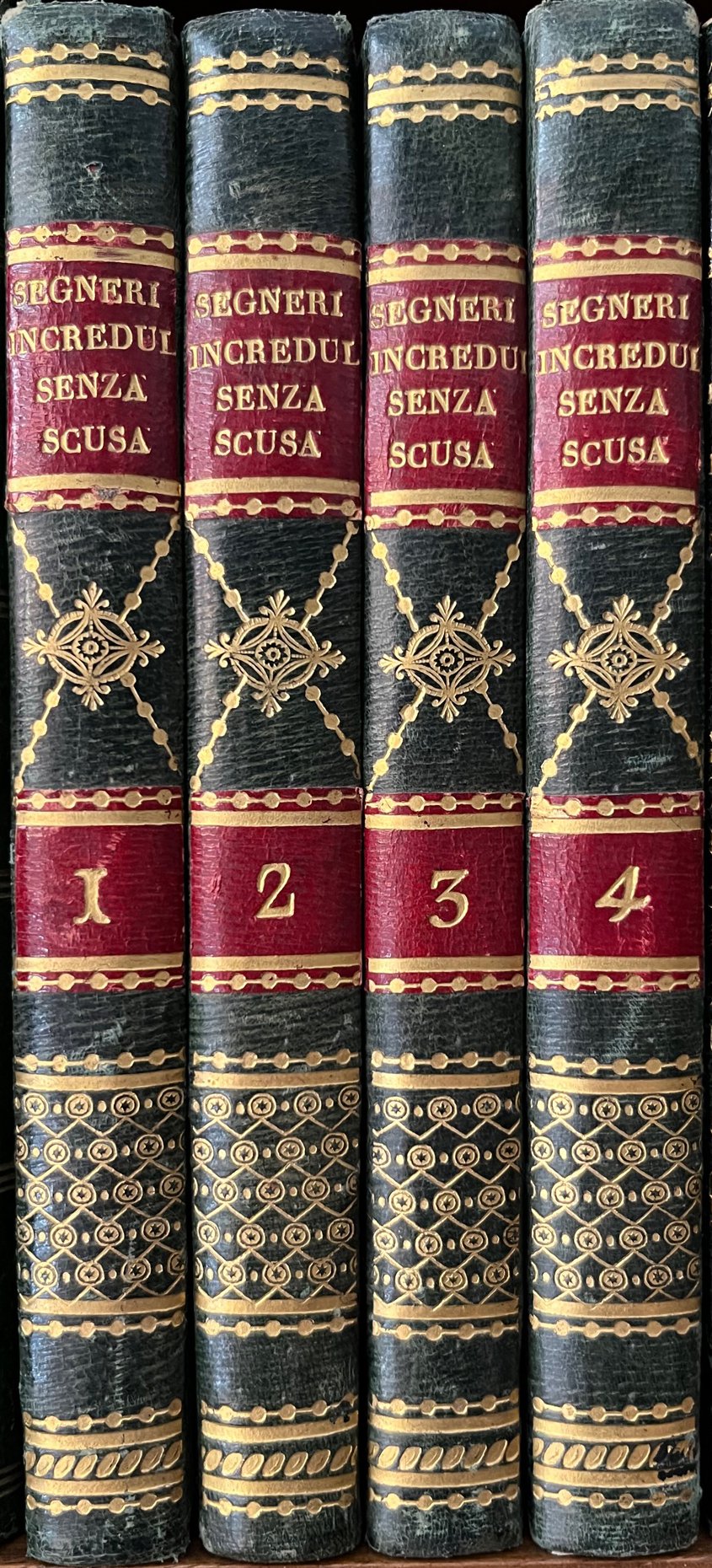 Bella legatura in mezza pelle verde con angoli, foxing alle prime e ultime pagine di ciascun volume, tagli spruzzati