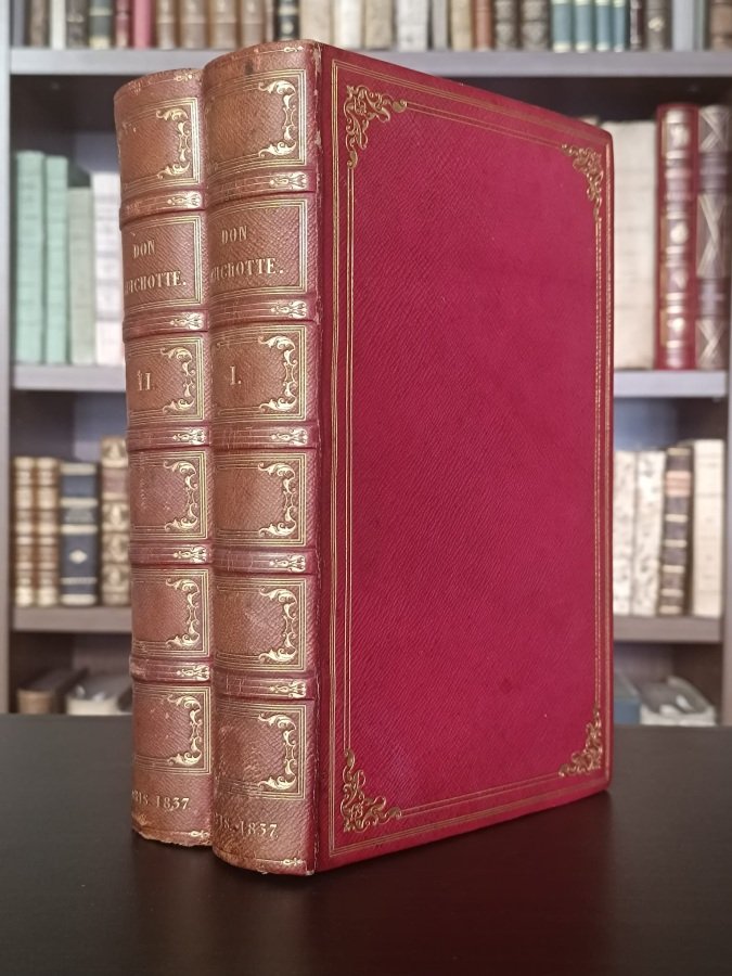 <span style="font-style: normal;">2 volumi in-8° (cm. 25,3), belle legature coeve in zigrino rosso, piatti inquadrati da due eleganti cornici romantiche in oro, esterna a triplice filetto e interna a duplice filetto ornata agli angoli, dorsi a nervi con titolo e fregi in oro sia ai comparti sia alle nervature (lievi tracce d'uso), labbri ornati in oro e filetti sempre in oro alle unghiature, tagli dorati; pp. [4] 744, 758 in buono stato, con indice anteposto al vol. II (alcune fioriture). Prima tiratura di questa bella edizione, riccamente illustrata da Tony Johannot con 4 tavole silografiche fuori testo (2 frontespizi incisi da Andrew, Best e Leloir e 2 antiporta </span><i>sur Chine volant</i> con il ritratto di Don Chisciotte al vol. I e due personaggi al vol. II) e di complessive 800 vignette silografiche del Johannot nel testo. «Un des très beaux livres illustrés du XIX s.»<span style="font-style: normal; font-size: 13.333333px;"> [Carteret III, 136-137]. Cfr. </span><span style="font-size: 13.333333px;">Brivois 90; Vicaire II, 155-6. <i>Ex Libris</i><i style="font-style: normal;"> inglesi </i>di <i>Richard Lane Freer e E. R. Dowdeswell</i><i style="font-style: normal;"> </i>applicati ai contropiatti. Esemplare molto buono. (SP1)</span>
