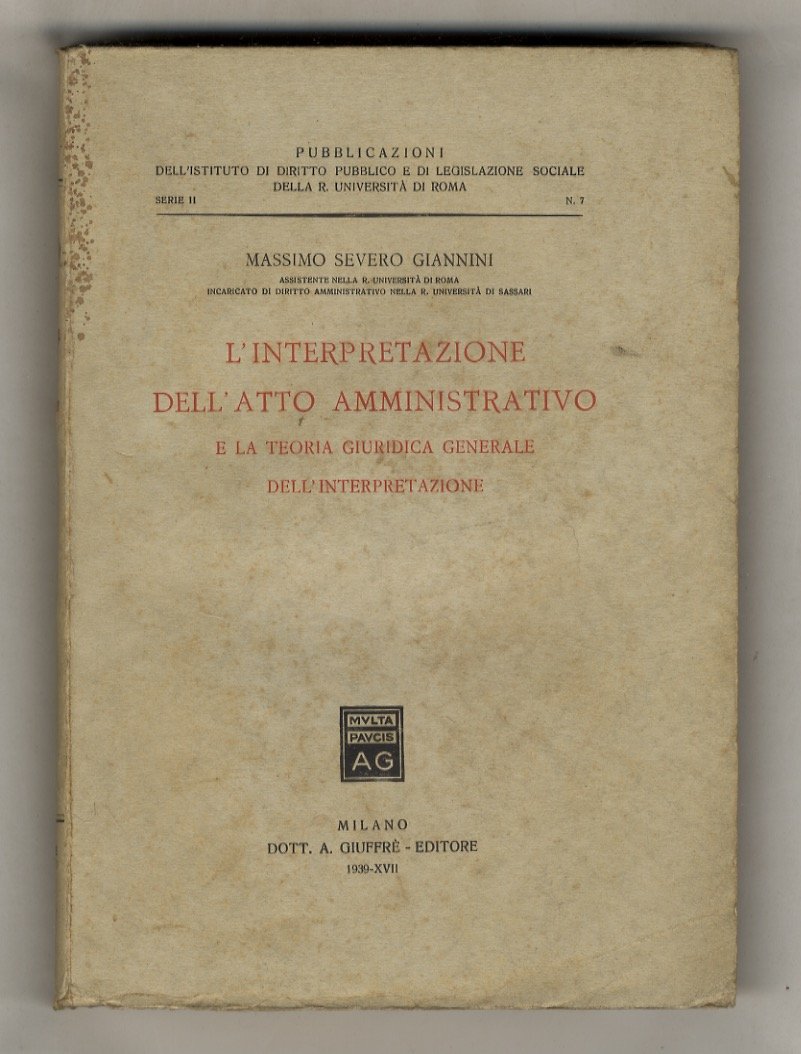 Milano, GIuffrè, 1939, in-8, brossura editoriale, pp. XVI, 386. Lievi tracce del tempo esterne; l'interno ottimo: ancora intonso. Rarissimo.