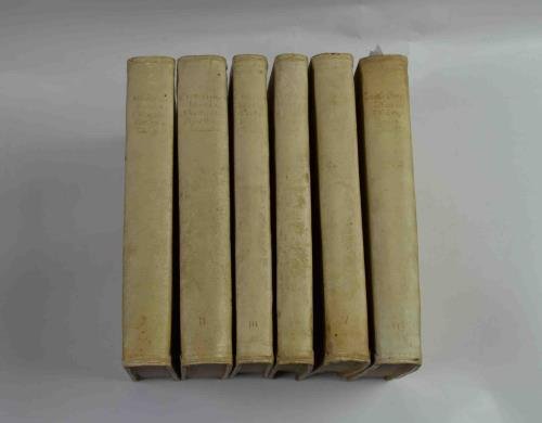 Sei volumi di cm. 24, pp. oltre 2.500 complessive. Stemma arcadico a ciascun frontespizio, ritratto del Caraffa cui l'opera è dedicata, ritratto dell'autore ed una tavola raffigurante il Bosco Parrasio, queste ultime poste al sesto volume dove appaiono anche 45 vignette xilografiche nel testo. Leg. strettamente coeva in cart. alla rustica con nervi passanti e titoli manoscritti ai dorsi. Esemplare con qualche fioritura sparsa, peraltro assai genuino e marginoso (in barbe). Si tratta della più ampia e completa edizione di questa storia letteraria apparsa in originale nel 1698 in un solo volume. Cfr. Piantanida, 3575: "La migliore edizione. e la prima completa" e Gamba (2212).