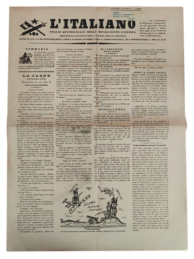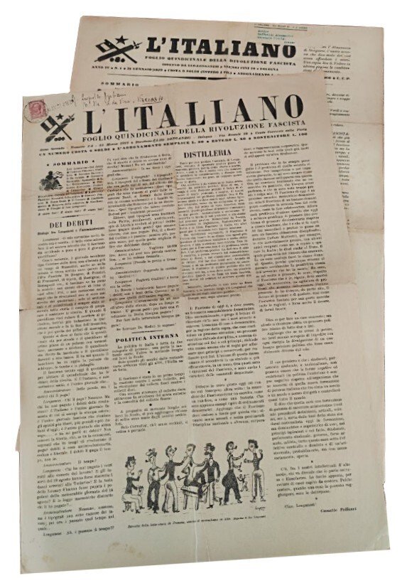 Mm. 501x351. pp. 4 cadauna. Con numerose vignette caricaturali e illustrazioni in b/n, inserti pubblicitari e contributi in prosa di Camillo Pellizzi, Leo Longanesi, Antonio Baldini... Testo stampato su 4 colonne, titolo alla prima pagina con marca figurata a lato. Francobollo di 'Montepulciano-Siena' e firma di possesso 'Leopoldo Giuliani via L. da Vinci Viareggio' posti sopra il titolo del numero 3-4 dell'anno secondo, etichetta postale 'Dottor Raffaello Alessandri Ospedale Civile Arezzo' al margine superiore della prima pagina del nr. 1, anno 4. Tracce di bruniture alle piegature e ai margini, piccole macchie di inchiostro, piccolo strappo alla p. 3 del nr. 1 anno IV. 2 fascicoli completi di questo quindicinale, fondato a Bologna il 14 gennaio 1926 da Leo Longanesi, dal luglio 1926 con sottotitolo: Foglio quindicinale della rivoluzione fascista, diventa mensile dal marzo 1931. Prime rare edizioni, in buono stato di conservazione.