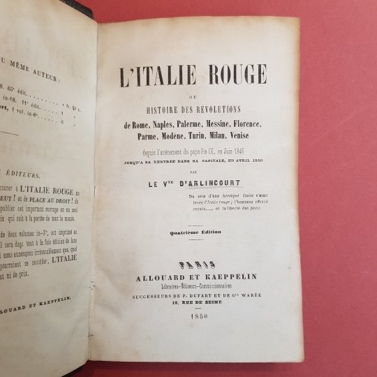 L'Italie rouge ou histoire des révolutions de Rome, Naples, Palerme, Messine, Florence, Parme, Modene, Turin, Milan, Venise depuis l'avènement du Pape Pie ix, en juin 1846, jusqu'a sa rentrée dans sa capitale, en avril 1850. Quatrienme edition