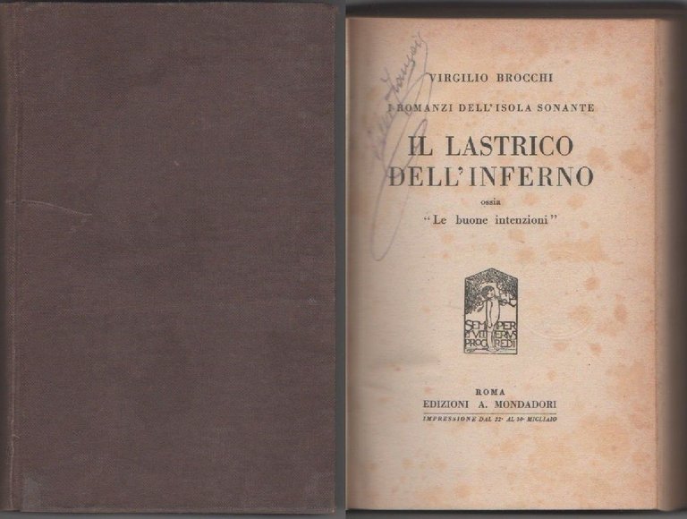 Il lastrico dell'inferno - Brocchi VirgilioMondadori 1920. IV volume della serie "I romanzi dell'isola sonante". Cartonato - 12x19 cm ca - 321pp. Tela non originale; firme d'appartenenza alla carta bianca; lievi tracce d'uso alla copertina; leggere fioriture all'interno; buono stato.