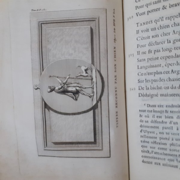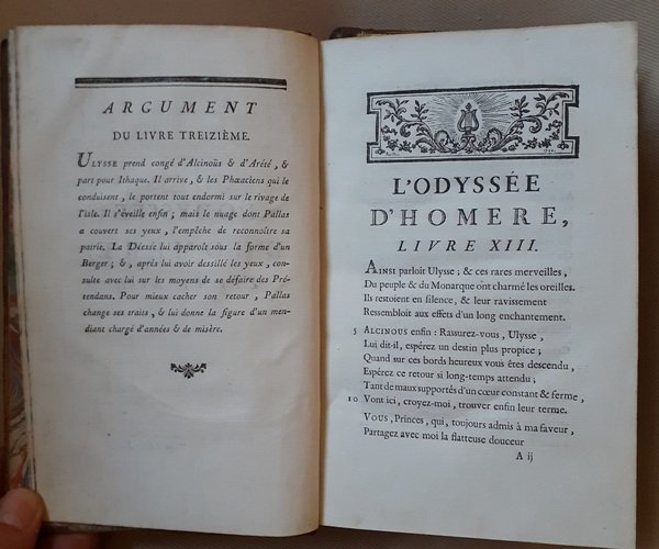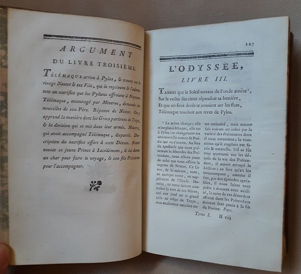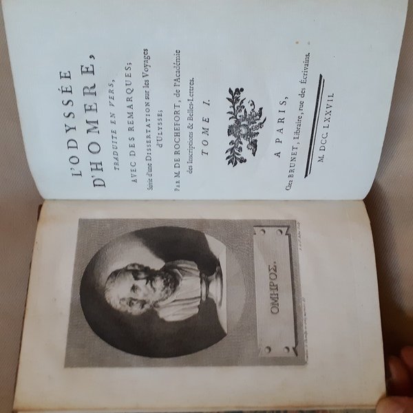 In-8°, (4) ritratto di Omero all’antiporta di A. de St. Aubin, 24 tavole f.t. incise da G.L. Biosse, 509pp (I) e (4), 458pp (II), (1), legatura in pelle con nervi e titolo in oro al dorso e sui piatti, sguardie e taglio marmorizzato, buone condizioni. Edizione rarissima, sconosciuta a Cohen-Ricci, che cita solo l’Iliade e non l’Odissea. Graesse III, 337In-8 °, (4) portrait of Homer at the frontispiece by A. de St. Aubin, 24 plates hors-texte engraved by G.L. Biosse, 509pp (I) and (4), 458pp (II), (1), calf binding with bands and golden title on the spine and on the covers, marbled endpaper and edges, good condition. Very rare edition, unknown to Cohen-Ricci, who only mentions the Iliad and not the Odyssey. Graesse III, 337