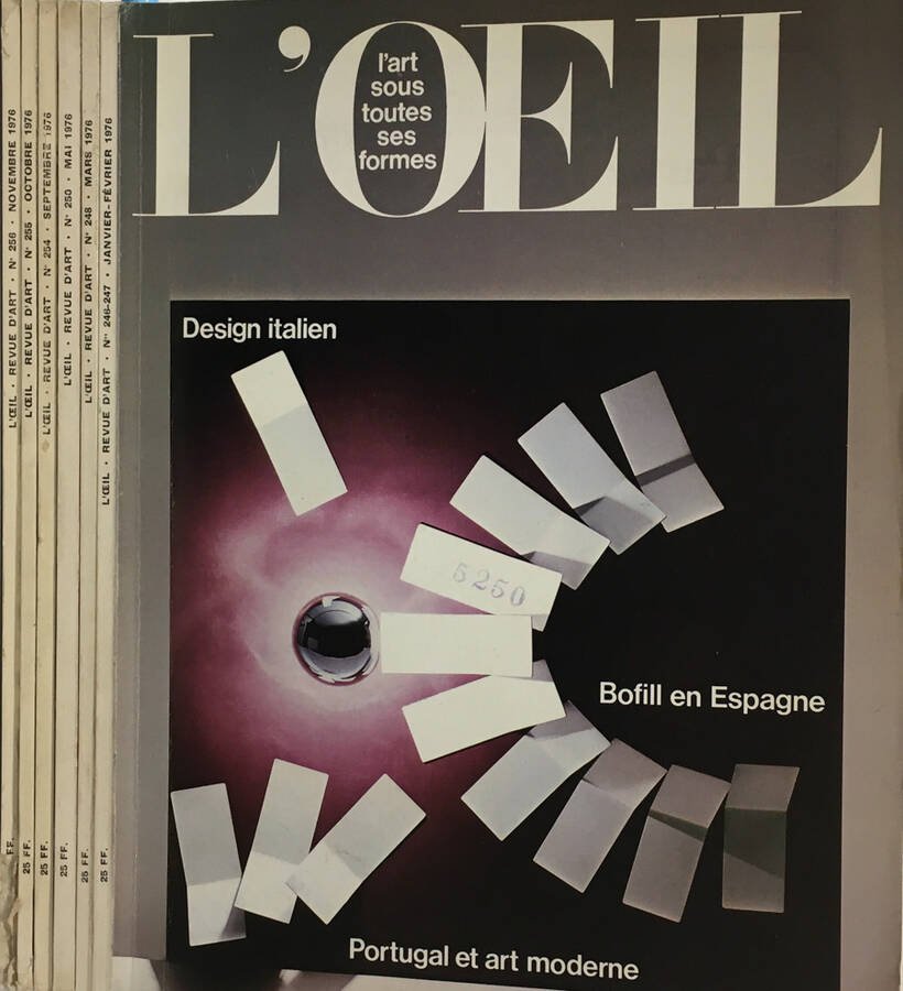 Opera incompleta, sono presenti 6 riviste, NN. 246/247 248 250 256 255 254 1976, del periodico mensile L'Oeil - Revue d'art mensuelle, fondato da : Rosemond e Georges Bernier, redattore capo: Gilles Néret. Stato discreto, coperta illustrata in cartoncino patinato, vari segni del tempo, bruniture, accenno di fioritura sparsa, pagine ben conservate. Ogni rivista presenta illustrazioni in b. e n. in testo e fuori testo, tavole, su carta patinata, a colori, inserzioni pubblicitarie, testo posto su tre colonne, timbro d'appartenenza su risguardia o su facciata successiva, il N. 246-247 ha timbro numerale su piatto anteriore, il N. 248 marzo lo presenta su quello inferiore, il N. 250 maggio su pagina successiva alla risguardia. Numero Pagine .