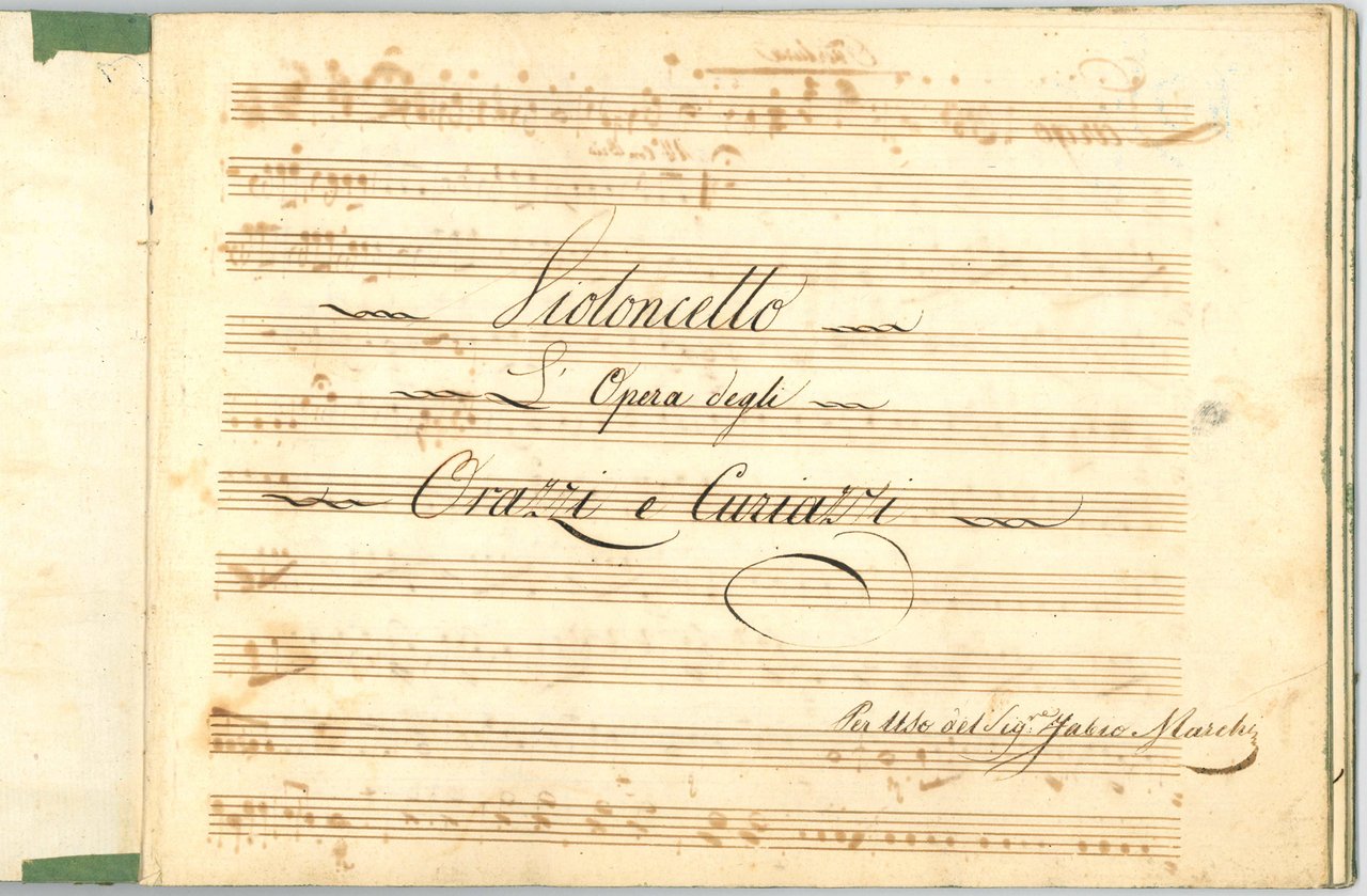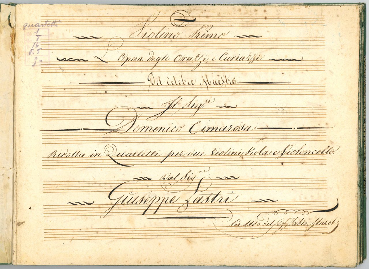L'Opera degli Orazzi, e Curiazzi del Celebre Maestro Il Sig:re Domenico Cimarosa ridotta in Quartetti per due Violini, Viola, e Violoncello dal Sig:re Giuseppe Lastri. Per Uso del Sig. Fabio Marchi. Musical manuscript on paper. [Venice?, c. 1790-1810]