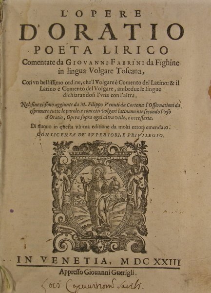 Appreffo Giovanni Guerigli, In Venetia, 1623. In/8 reliure plein velin ancien, 3 ff. 776 p., 66 ff. de glossaire, texte en italien à double colonne et disposé en glose encadrante. Nom écrit à l’encre en page de garde ; auréole sur les 6 premiers feuillets ; fine galerie d’insecte de la page 565 à 575 en marge sans perte de texte ; restaurations maladroites : p. 641 et 750 ; auréole claire de la p. 482 à 495 ; quelques feuillets brunis. Belle impression vénitienne des oeuvres du grand poète lyrique et satirique latin. Les commentaires en toscan sont dus à Giovanni Fabrini, grammairien qui fut pendant de longues années professeur d’éloquence à Venise. Le longueruanaI, 28 en fait l’éloge, indique Brunet III, 332.8 mo in full contemporary vellum, flat spine, [3], 776 p., [66]. Fex flaw : ink marginalia on blancks, waterstain on the 6 first sheet & from 482 to 495 ; wormholes from p. 565 to 575 (margin) without loss of text ; awkward paper restauration on p. 641 & 750 ; few browned sheets. Ttext in italien (Toscanien) printed in double columns with numerous framed gloss. Fine Venicien printing of the great lyrical & satyrical poet. Bibl : Brunet III. 332.