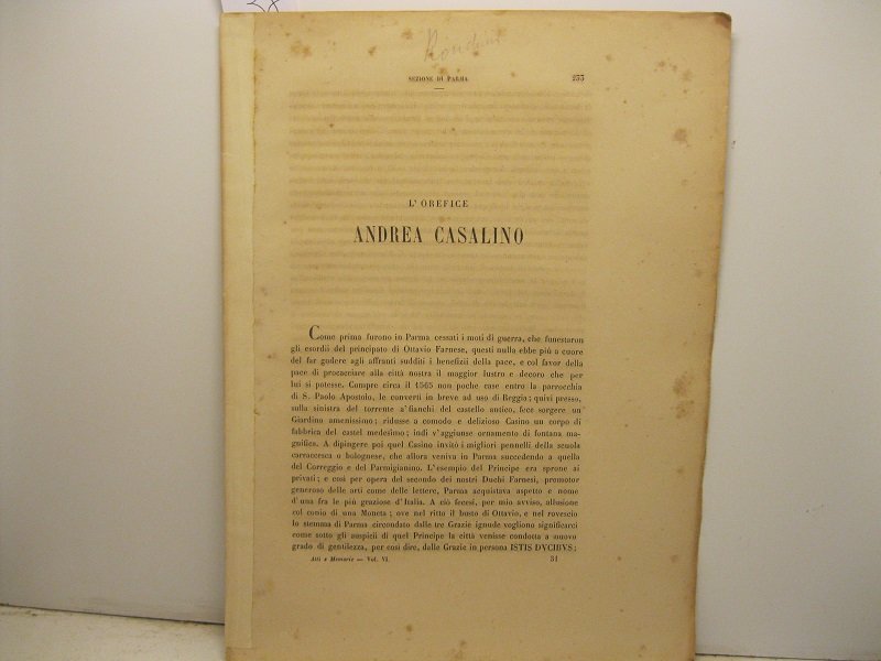 In 4, pp. 233-244. Esemplare privo di legatura all'origine. Estratto dagli Atti e Memorie della Deputazione e Storia Patria Province Modenesi e Parmensi', VI, 1872. Pazzi, 'Contributi per la storia dell'oreficeria', I, p. 212.
