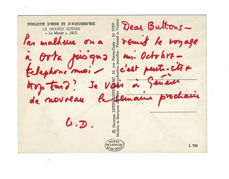 Sommières 14-09-1971 | 10.50 x 14.50 cm | une carte postale et enveloppe | [ENGLISH DESCRIPTION ON DEMAND] | Carte postale autographe signée L.D. de Lawrence Durrell adressée à Jani Brun, rédigée au feutre rouge, au verso d'une reproduction d'affichette Mystification imaginée par Jacques Yonnet Pour nos Hôpitaux, Ambulances, Trains sanitaires, demandez l'Oreiller Militaire Français qui procure le plus doux des soulagements. [.], publicité extraite d'un journal scotchée en direct avec une glande virile., enveloppe jointe. L'écrivain organise un voyage avec sa jeune amante montpelliéraine : Buttons. je ne vous crois pas ! je suis ici pour 15 jours encore - puis Genève pour une semaine. Après de nombreuses années passées en Grèce, en Egypte et à Rhodes, l'écrivain voyageur Lawrence Durrell fut contraint de fuir Chypre à la suite de soulèvements populaires qui menèrent l'île à son indépendance de la couronne britannique. Riche seulement d'une chemise et d'une machine à écrire mais auréolé du succès de son roman Bitter Lemons of Cyprus (Les citrons acides), il arriva en 1956 en France et s'établit dans le village languedocien de Sommières. Dans la « maison Tartès », sa grande demeure entourée d'arbres, il écrivit la seconde partie de son œuvre, son monumental Quintette d'Avignon, s'adonna à la peinture et reçut ses illustres amis, dont le couple Henry Miller et Anaïs Nin, le violoniste Yehudi Menuhin, l'éditeur londonien Alan G. Thomas, et ses deux filles Pénélope et Sappho. Parmi les oliviers et sous le soleil méditerranéen, il y rencontre au milieu des années 1960 la jeune et pétillante Jany (Janine Brun), montpelliéraine d'une trentaine d'années à la beauté ravageuse, qui travaillait au département des Antiquités de la Sorbonne à Paris. Elle fut prénommée « Buttons » en souvenir de leur première rencontre, où la jeune fille portait une robe couverte de boutons. Henry Miller tomba également sous le charme de « Buttons », louant sa beauté et son éternelle jeunesse dans d'exceptionnelles lettres restées inédites. Les trois compères passèrent des soirées parisiennes mémorables dont nous gardons de précieuses traces autographes à travers leurs échanges épistolaires. Recommandée par Durrell, elle fit de nombreux voyages notamment en Angleterre d'où elle reçut une vaste correspondance de l'écrivain ainsi que des œuvres d'art originales signées de son pseudonyme d'artiste, Oscar Epfs.