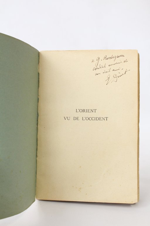 H. Piazza • P. Geuthner | Paris s. d. [1921] | 11.50 x 19 cm | relié | First edition of which there were no grand papier (deluxe) copies, an advance (service de presse) copy. Small foxing on covers marginally and slightly sunned, one joint cracked and glued down to foot, a small tear to head of spine. Illustrated, as frontispiece, with a drawing by Etienne Dinet. Handsome autograph inscription signed by Etienne Dinet to Georges Rochegrosse : A G. Rochegrosse cordial souvenir de son vieil ami. * [FRENCH VERSION FOLLOWS] | Edition originale pour laquelle il n'a pas été tiré de grands papiers, un des exemplaires du service de presse. Petites piqûres sur les plats marginalement et légèrement insolés, un mors fendu et recollé en pied, une petite déchirure en tête du dos. Ouvrage illustré, en frontispice, d'un dessin d'Etienne Dinet. Précieux envoi autographe signé d'Etienne Dinet à Georges Rochegrosse : A G. Rochegrosse cordial souvenir de son vieil ami.