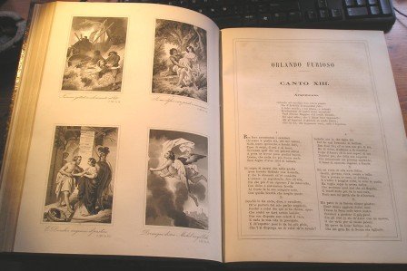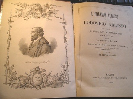 Milano, Francesco Pagnoni Editore, 1870; a cura di Eugenio Camerini. Mz tela con titolo in oro al dorso, piatti marmorizzati, in 4° cm 35; pp. XXX-(6) 1231. Testo su due colonne entro riquadro, 25 tavole di illustrazioni, ognuna contenente 4 incisioni. Una incisione in antiporta con ritratto dell'A. entro cornice allegorica. Ottime condizioni. All'interno conservato un articolo di giornale in data 10/11/1933 a firma di Ettore Romagnoli: "La celebrazione fascista di Ludovico Ariosto in Campidoglio"