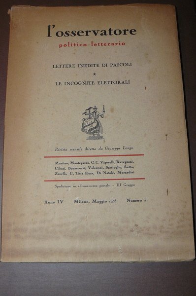 L'osservatore politico letterario. lettere inedite di Pascoli. Le incognite elettorali. Rivista mensile diretta da Giuseppe Longo.