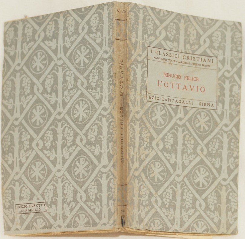 In 8. Dim. 19,5x13 cm. Pp. XXIX+(3)+110+(6). Bella edizione del 1930 della serie "I classici cristiani Ezio Cantagalli" della nota opera "L'Ottavio" scritta da Minucio Felice, grande esponente della letteratura apologetica a cura di Benedetto Neri. L'opera è incentrata su un dialogo che ha per protagonisti Cecilio e Ottavo sulla spiaggia di Ostia. Interessante reclame pubblicitario all'inizio del volume per l'invio gratuito di 70 Vangeli per diffondere la fede cristiana a discapito di quella Protestante. Bella brossura editoriale decorata. Frontespizio entro cornice. In buone condizioni Copertina editoriale in buone condizioni generali con lievi usure ai margini e dorso. Legatura in buone condizioni. All'interno le pagine si presentano in ottime condizioni con fioriture Beautiful edition of 1930 of the series "I classici cristiani Ezio Cantagalli" of the famous work "L'Ottavio" written by Minucio Felice, great exponent of apologetical litterature written by Benedetto Neri. The work is about a dialogue with the carachters Cecilio and Ottavo in the land of Ostia. Interesting advertising reclame at th ebeginning of the volume for the free delivery of 70 Gospels to spread Christian Faith against the Protestant Faith. Beautiful editorial decorated cover. Title page in a frame. In good conditions. Editorial cover in very good general conditions slightly worn in the edges and spine. Binding in good conditions. Inside pages are in very good conditions with foxings.