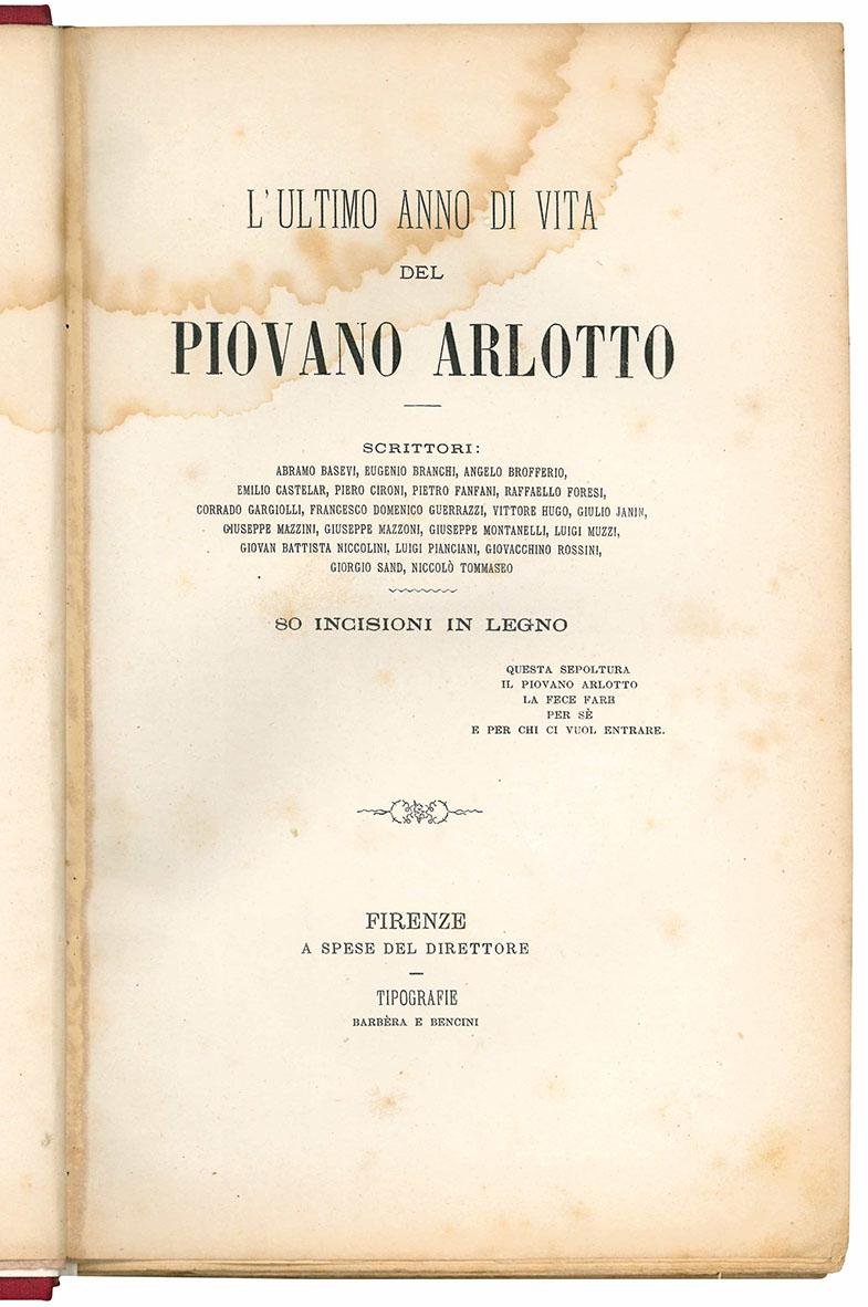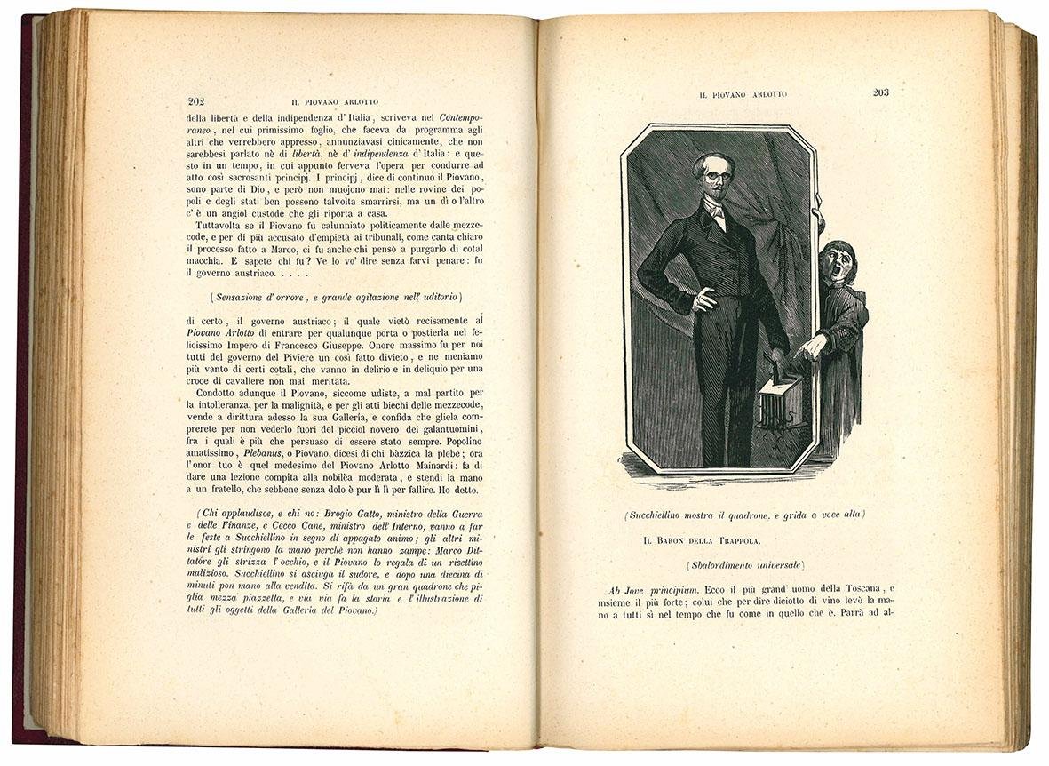 In 8vo (mm 245x155); pp. 880, IV c. di tav. fuori testo. Occhietto, 80 incisioni satiriche in bianco e nero nel nesto e 4 alberi genealogici (riguardanti la famiglia Bonaparte) ripiegati fuori testo. Carta leggermente ed uniformemente brunita, lievi fioriture, aloni diffusi. Mezza tela rossa con titolo in oro su tassello al dorso. Sono conservate le brossura originali. Contiene scritti di A. Brofferio, P. Cironi, P. Fanfani, R. Foresi, F. D. Guerrazzi, V. Hugo, G. Mazzini, G. Mazzoni, G. Montanelli, G.B. Niccolini, N. Tommaseo, ecc.