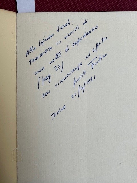 In-8°, pp. 129, brossura editoriale. Bella dedica autografa a Sara Tommasi dell'autore alla prima carta bianca. Edizione originale. Guido Fubini (Torino, 20 ottobre 1924 – Torino, 22 febbraio 2010) è stato un avvocato e giurista italiano, consigliere delle comunità ebraiche italiane. Ebreo torinese, antifascista, politicamente impegnato nel Partito Socialista Italiano, ha condotto importanti battaglie di libertà e uguaglianza per la difesa delle minoranze e della libertà di culto. In queste pagine autobiografiche gli avvenimenti che lo coinvolsero all'indomani dell'8 settembre 1943. In uno stile asciutto quasi 'gobettiano' la narrazione prende origine dal periodo di emigrazione in Francia, a Nizza.'