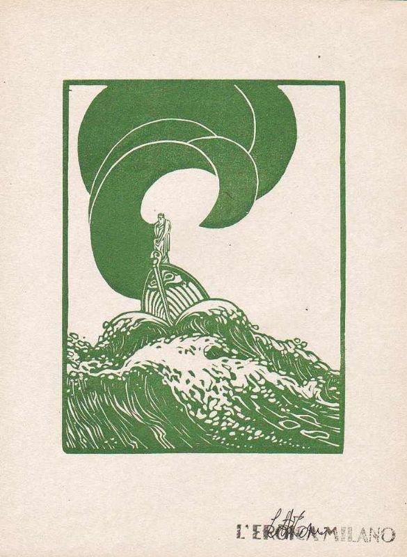 Foglio di cm 30 x 22 circa; l'immagine è stampata in inchiostro verde (cm 20 x 14,5). Prova di stampa della xilografia che andrà alla p. 13 del Quaderno 87-90 de L'Eroica, dedicato interamente a Giovanni Pascoli; al verso l'incipit della lirica Il mondo era all'aurora, di Carlo Ravasio; nell'angolo in basso a destra timbro 'L'Eroica Milano' e firma del direttore della rivista, Ettore Cozzani. Ottimo stato di conservazione.