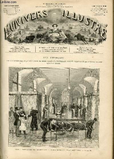 L'UNIVERS ILLUSTRE - VINGTIEME ANNEE N° 1168 - Paris, installation des malades dans le nouvel Hotel-Dieu (Salle Saint-André).