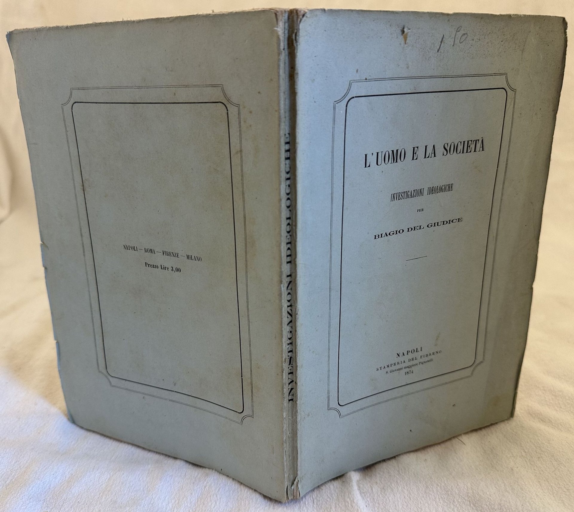 Prima edizione del 1874 di questo studio di filosofia di Biagio del Giudice. L'opera è divisa in tre parti: Dello individuo, Della società, Dei fatti soggetti alle leggi e dell'amministrazione della giustizia. In buone condizioni Copertina editorial in buone condizioni con lievi usure marginali. Legatura in buone condizioni. All'interno le pagine si presentano in buone condizioni con rare fioriture. In 8. Dim. 24x16 cm. Pp. 134. First edition of 1874 of this study opf phylosophy by Biagio del Giudice. The work is divided into three parts: Man, Society, facts subjected to laws and administration of justice. In good conditions. Editorial cover in good conditions lightly worn in the extremities. Binding in good conditions. Inside pages are in good conditions with foxings. In 8. Dim. 24x16 cm. Pp. 134. <BR>