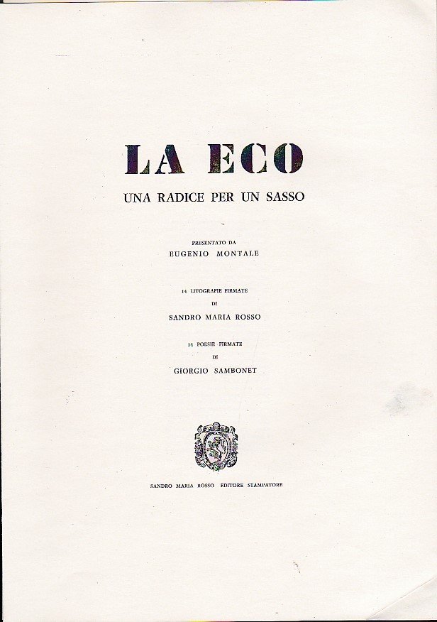 Portfolio in-4° (300x210mm), pp. 16 di testi a fogli sciolti + 28 litografie originali f.t. di Sandro Maria Rosso su quartini sciolti, firmate sia dall'artista che da Sambonet (le lastre furono biffate dopo la stampa), suddivise in 2 cartelle all'insegna incrociata di 'Un sasso per una radice' e 'Una radice per un sasso'. Perfetto stato. Edizione originale ed unica, tirata a 99 esemplari, di cui 80 numerati e 19 ad personam (il nostro esemplare fa parte dei 19 ad personam ed è stampato per Claudia Sambonet Ferrari). Testo in italiano e in inglese. 'Sono immagini che parlano da sole nel suggestivo incontro di tecniche tanto diverse come quelle dell'arte grafica e della parola. L'insieme è tutt'altro che ibrido. Più che di sincretismo si potrebbe parlare di effettiva collaborazione' (Montale).