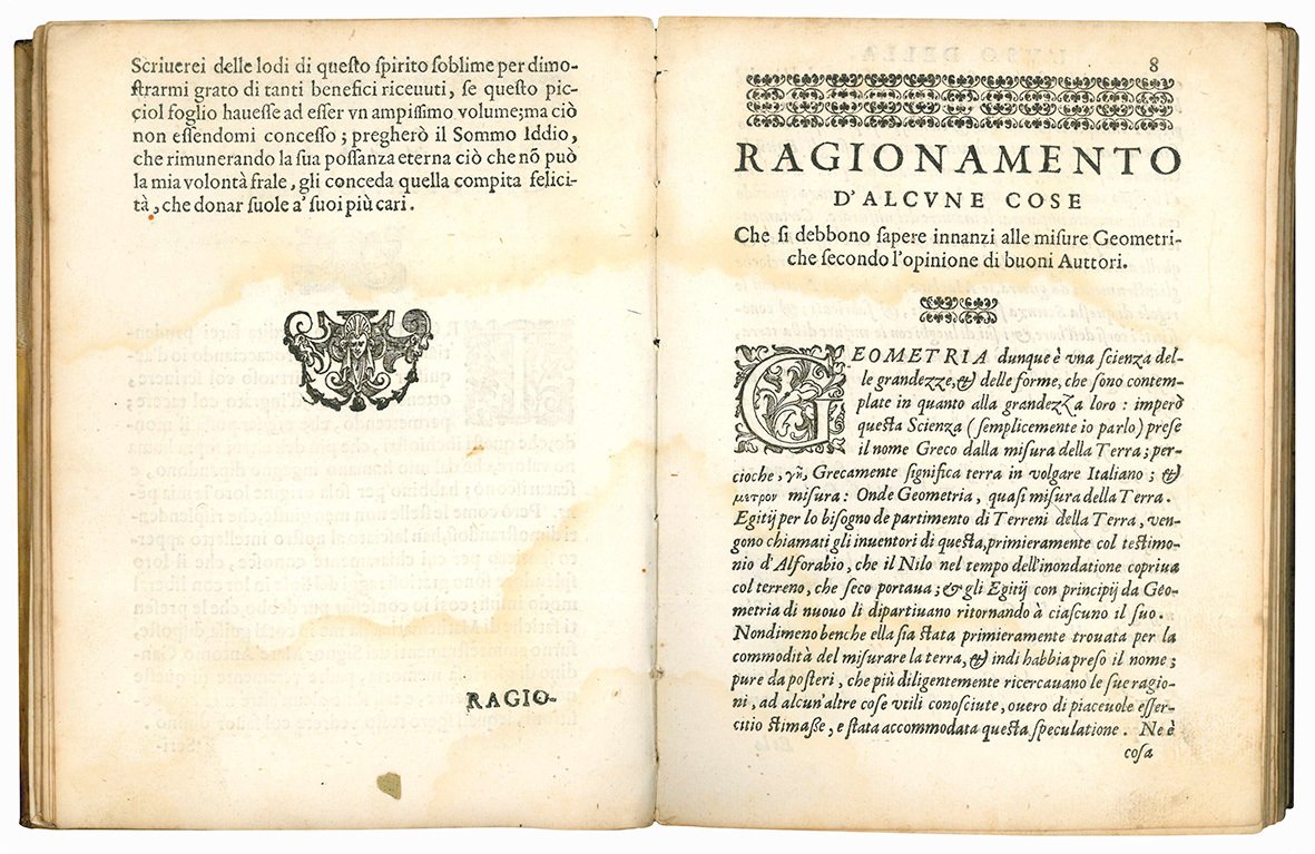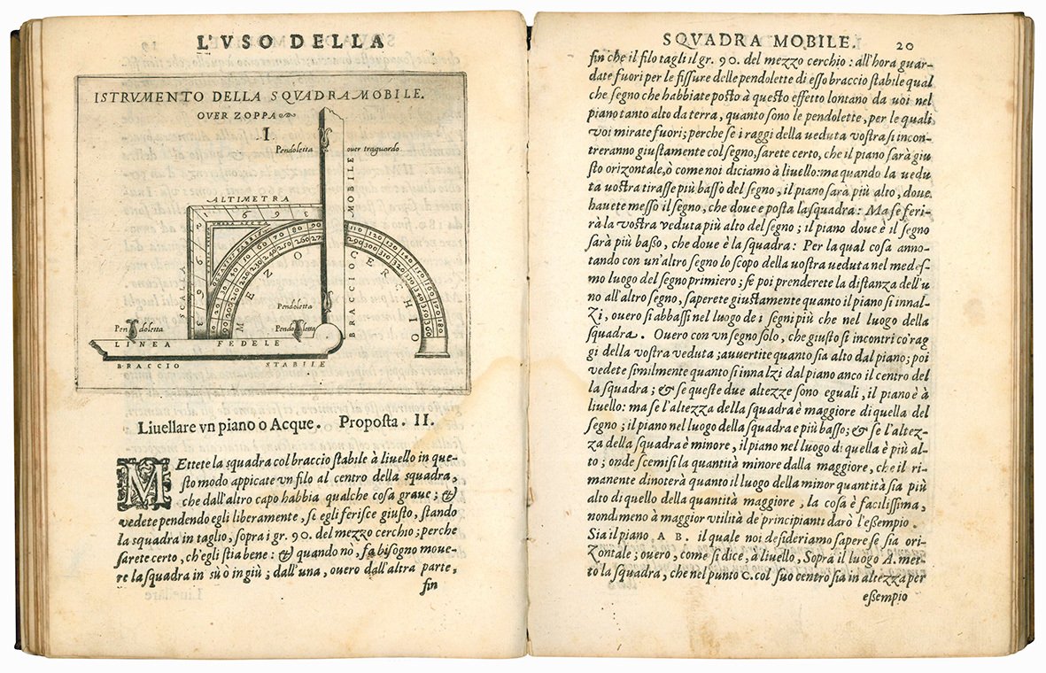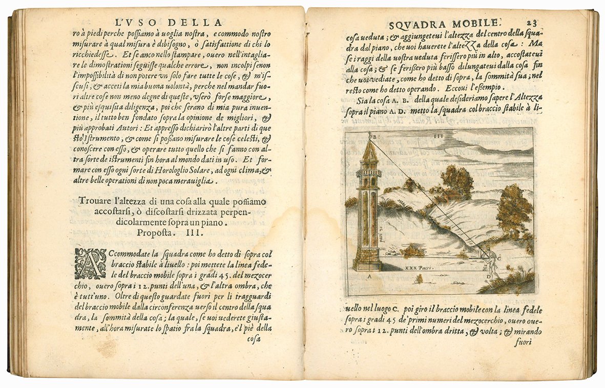 Prima edizione di questa importante opera sull'applicazione della triangolazione. Ottavio Fabri è stato un matematico attivo principalmente a Padova. Il suo più grande contributo alla disciplina, presentato in quest'opera, fu l'invenzione della squadra mobile, uno strumento geometrico in ottone utilizzato per misurare, livellare e trasferire su carta ogni distanza, altezza e profondità, con applicazioni in astronomia, geometria e nella misurazione del terreno. L'edizione fu stampata in due tirature, con diverse carte preliminari, anche se non è stata stabilita una priorità.
