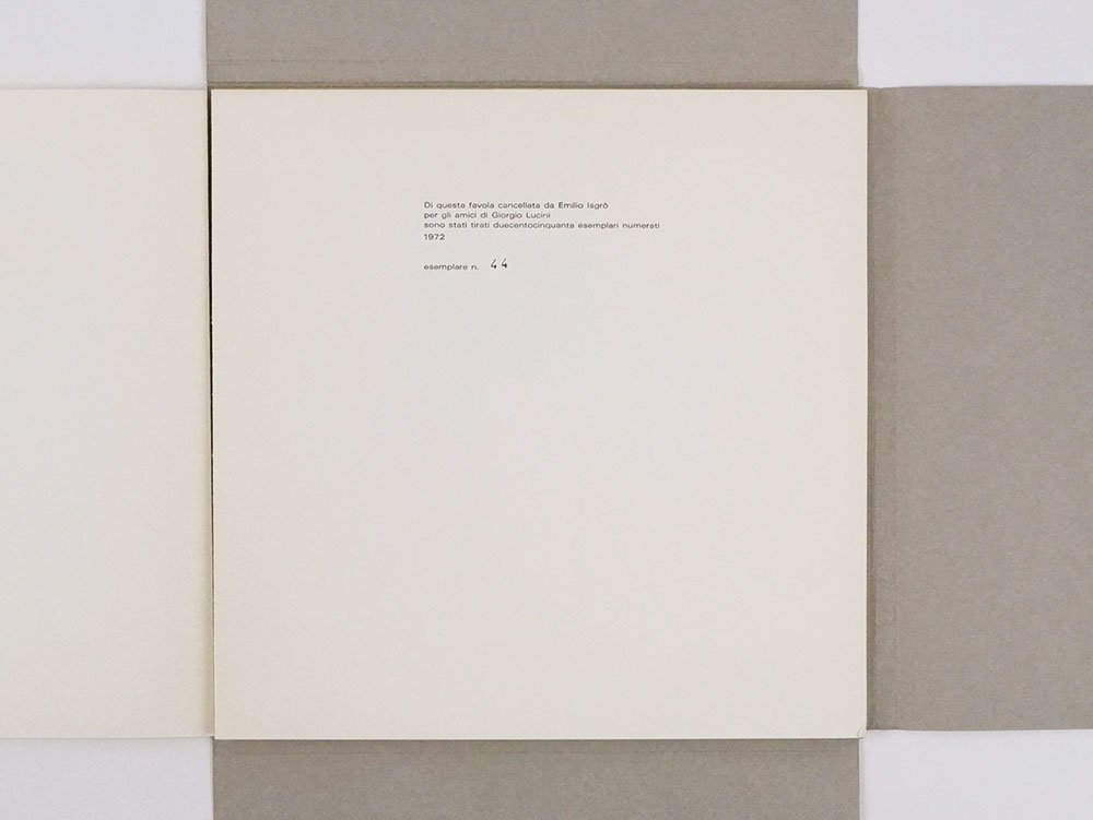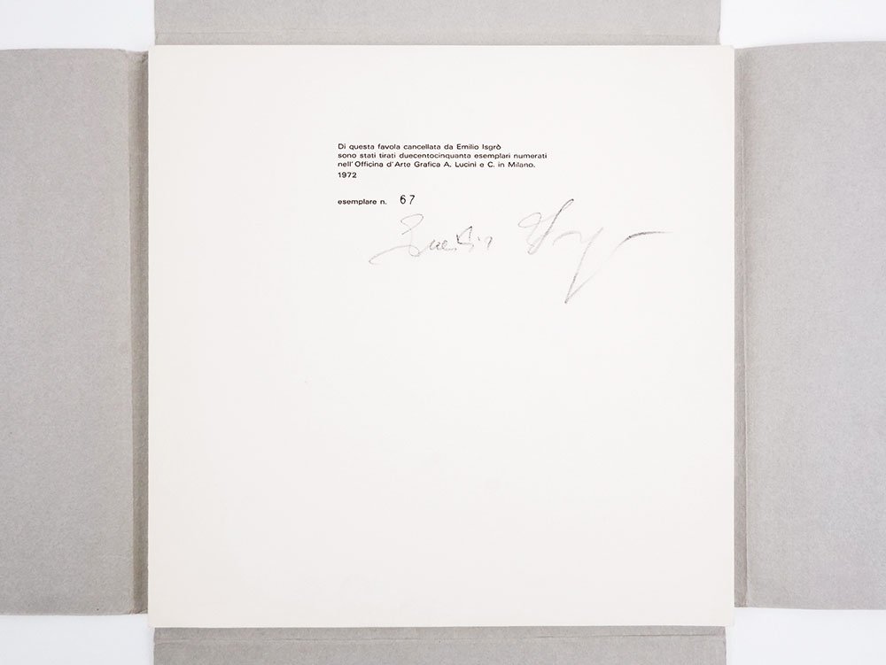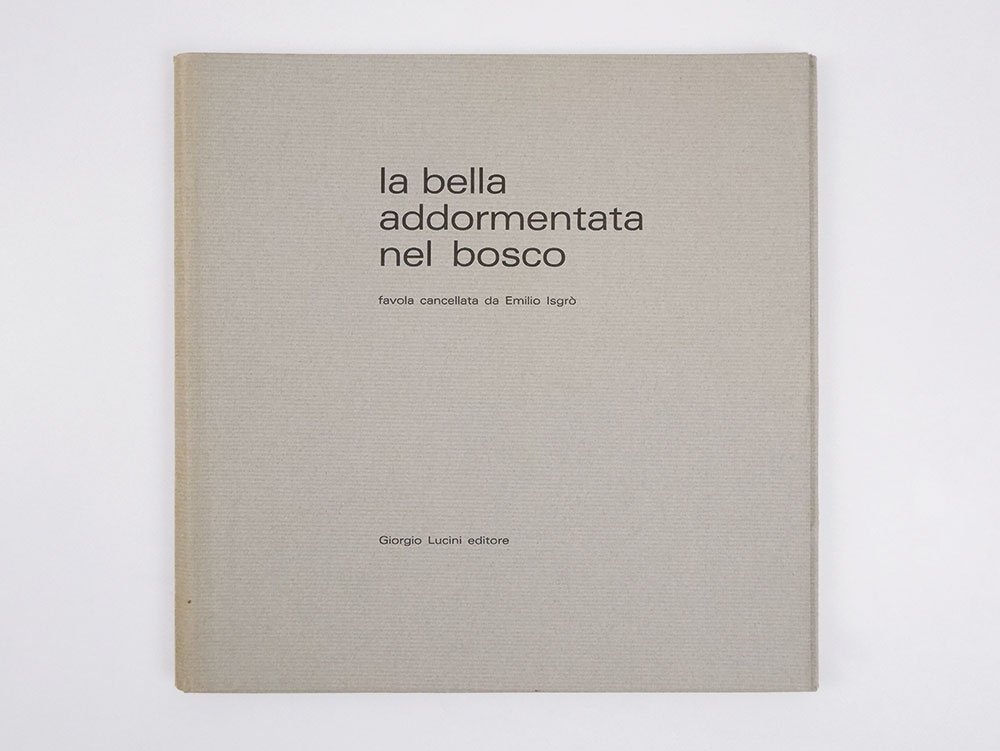 LIBROEdizione originale.CON AUTOGRAFO.Esemplare 67 di 205 numerati a macchina, pregiato dalla firma autografa dell’artista sul colophon; in ottime condizioni di conservazione, completo in ogni sua prevista parte.Tirato in soli 250 esemplari numerati, e oggi divenuto molto raro, «La bella addormentata nel bosco» è uno dei primi e più rilevanti libri d’artista di Emilio Isgrò, preceduto solo dal «Cristo cancellatore» pubblicato dalla Galleria Apollinaire nel 1968 («Dichiaro di non essere Emilio Isgrò» e «Poesie visive e cancellature», del 1971, sono cartelle di tavole sciolte) e seguito da una lunga pausa interrotta solo dal «Poeta Alberto Lùcia» del 1985. -- Grazie al maestro stampatore Lucini — che ricorda con sofferenza nelle sue memorie le quattro passate di nero necessarie alla resa tipografica delle pagine cancellate — le famose “cancellature” dell’artista assumono in quest’opera un particolare pregio estetico, grazie alla presenza di alcuni colori di fondo e alla qualità formale di alcune di esse (per esempio i numeri di pagina obliterati da una forma di foglia).The Altered Page: Selections from the Ruth and Marvin Sackner Archive of Concrete and Visual Poetry (1988), n. 21; Far libro: libri e pagine d'artista in Italia (1989), n. 115
