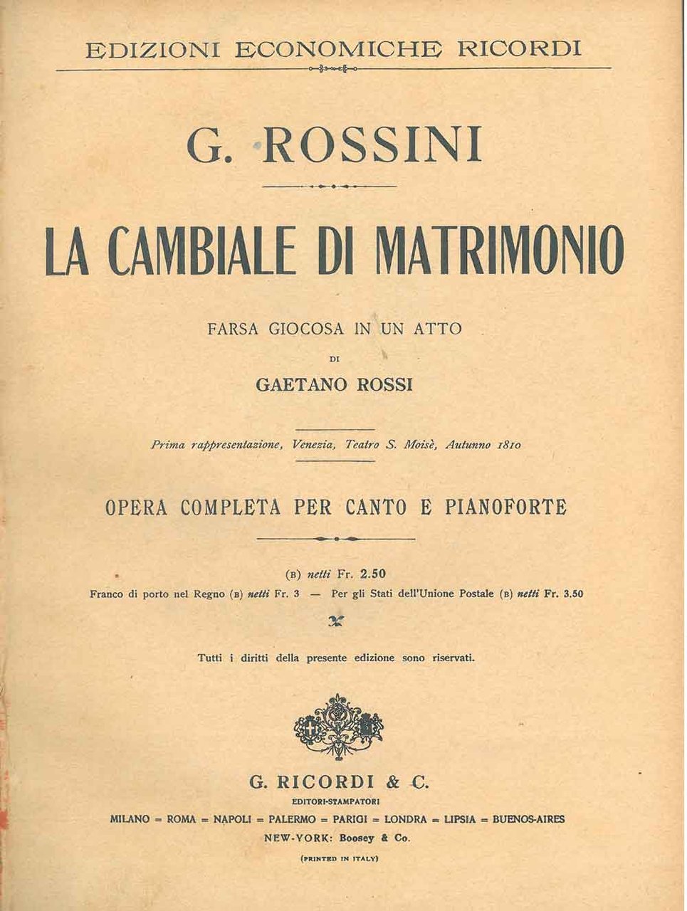 La cambiale di matrimonio. Farsa giocosa in un atto. Opera completa per canto e pianoforte