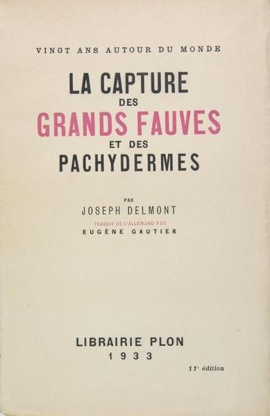 Paris, Librairie Plon, 1933. In-8 broché, couverture imprimée, 6 planches photographiques hors texte sur papier couché, 298 p. Joseph Demont parcourut tour à tour les jungles de l’Inde, le Bengale, le Boutan fermé aux étrangers, l’Afghanistan où il fut prisonnier, les savanes de l’Amérique du Sud, les régions inexplorées de l’Australie, les déserts Africains. Il acquit ainsi une extraordinaire connaissance des moyens à utiliser pour capturer le gros gibier. Texte réédité de nombreuses fois.