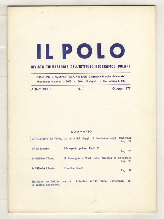 La carta del viaggio di Francesco Negri (1663-1666). [In: “Il Polo”. Rivista trimestrale dell'Istituto Geografico Polare, Anno XXXIII, n. 2, Giugno 1977].