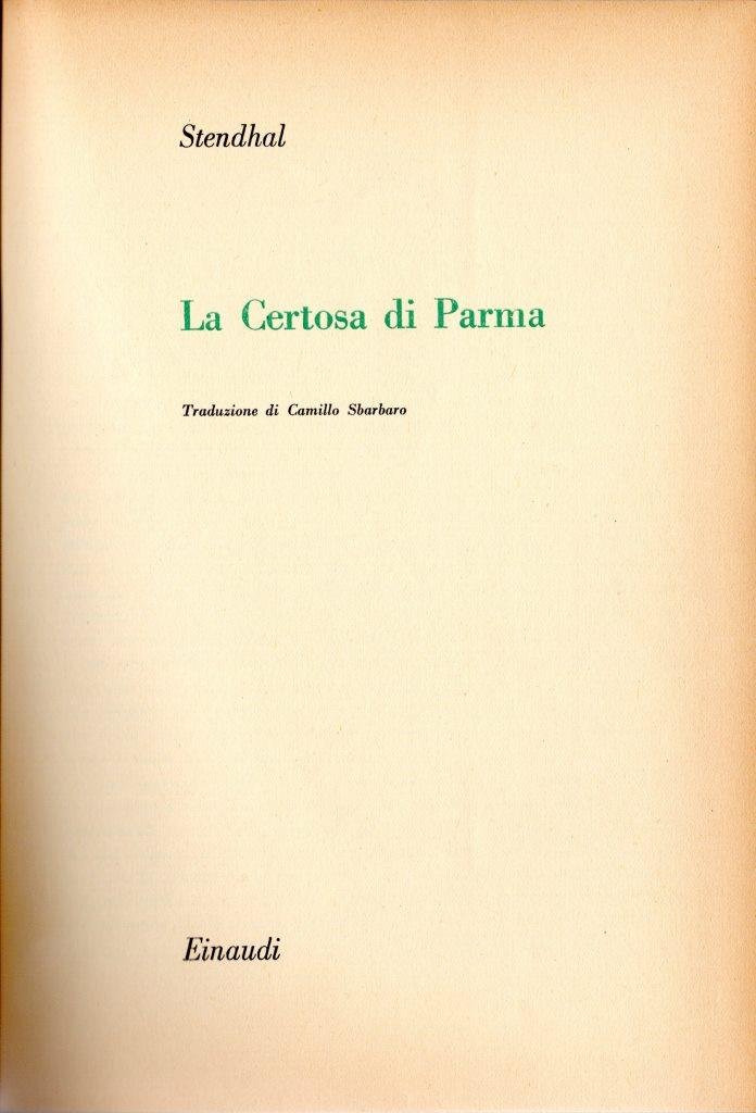 La Certosa di Parma, traduzione di Camillo Sbarbaro, terza edizione 1953, pp 415, formato 15,2x21,8. Firma di appartenenza.
