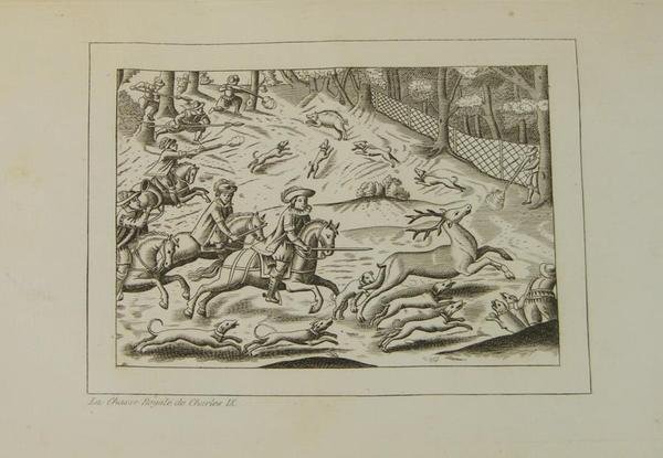 A Paris, Veuve Bouchard-Huzard, 1868. In-12 demi-chagrin vert, dos à nerfs, 131 p., frontispice avec serpente. Ex-libris contrecollé sur page de garde "bibliothèque de Folembray". Bel exemplaire, très propre, hormis quelques éraflures sur le plat et la coiffe inférieure. Orné d’un frontispice gravé sur cuivre, reproduisant la vignette du titre de la fort rare édition originale de 1625. Ce livre est spécialement consacré à la chasse du Cerf. Il fut écrit par Nicolas de Neufville, sieur de Villeroy, sous la dictée même de Charles IX. Thiébaud, 171 pour une autre édition.