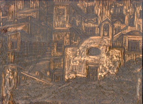 Legno originale per xilografia, inciso sui due lati, di cm. 36 x 28. Firma in basso.