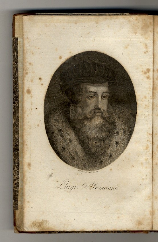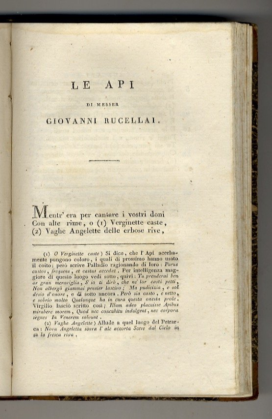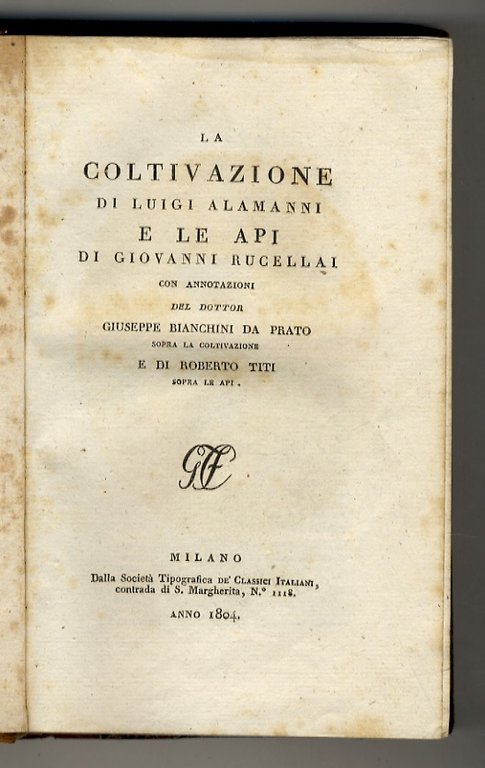 Milano, Società tipografica de' Classici italiani, 1804, in-8, legatura di poco successiva in mezza pelle, titolo e filetti in oro al dorso, pp. 88, 324. Con ritratti dell'Alamanni, inciso in rame da Paolo Caronni all'antiporta, e altro ritratto del Rucellai inciso dal Boggi a fronte dell'occhietto de "Le Api". Buon esemplare.