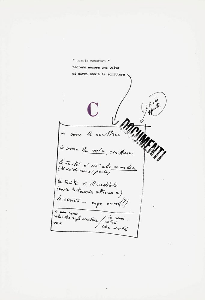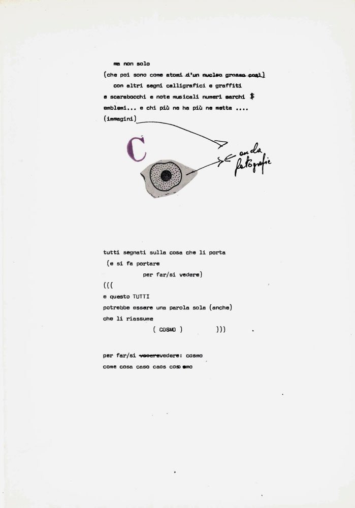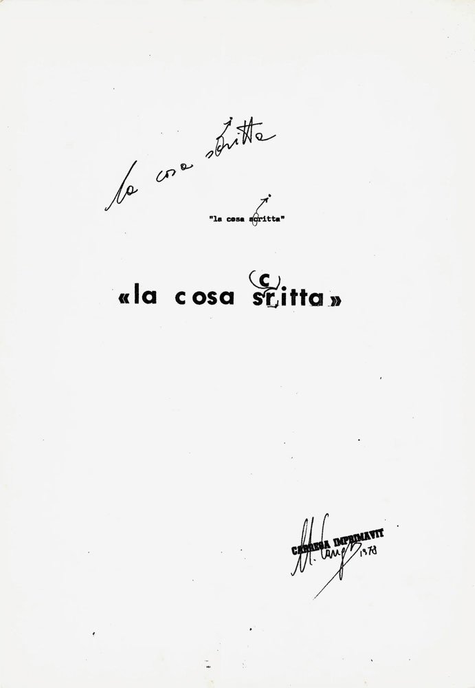 LIBRO Edizione originale. Lievissimo foxing alla brossura, per il resto esemplare molto buono. Esemplare numero 122 di 200 numerati e firmati a mano dall’A. Il poeta/artista si sbizzarrisce pubblicando sorta di ‘bozze’ con interventi manoscritti riprodotti, ‘bozze’ sulle quali lavora poi con pennarelli di diverso colore, timbri e collages di varia natura (carta, fiammifero, ritaglio di giornale.) fino a farne delle vere e proprie tavole. Si noti che il titolo è composto con la «c» di «scritta» di volta in volta come fosse stata stampata per errore alla linea superiore o come si debba spostarla alla linea superiore, con relativi simboli di correzione. Raro.