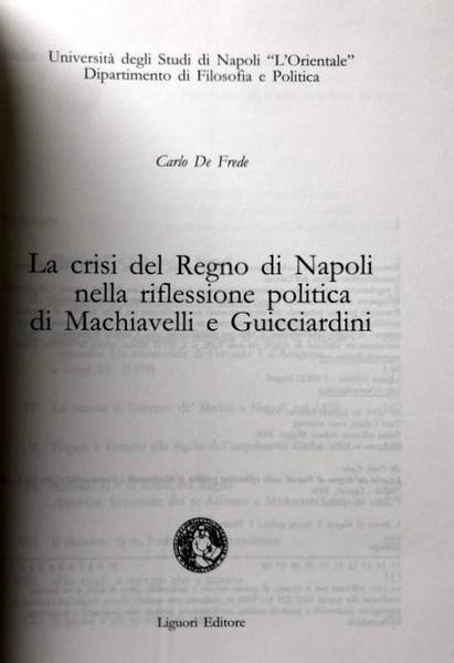 Soggetti: Filosofia, Etica, Filosofia politica, Stato, Concezione, DIritto, Storia moderna, Storiografia, Giuristi, Regno di Napoli, Pensatori, Riflessioni, Viceregno, Ferrante d'Aragona, Spagna, Dominazione straniera, Carlo d'Asburgo, Giacomo Piccinino, Omicidi politici, Chiesa, Condottieri, Congiure, Baroni, Intrighi, Diplomazia, Potere, Equilibrio, Francesco Sforza, Il Principe, Quattrocento, Cinquecento, Rinascimento, Ducato di Milano, Francia, Francesi, Cultura, Oppressione, Nobiltà, Burocrazia, Aristocrazia, Reali, Plebe, Storia d'Italia, Mezzogiorno, Crisi, Commentari della luogotenenza, Carlo VIII, Cancelleria aragonese, Archivi, Studi storici, Libri Vintage, Fuori catalogo, Pietro Giannone, Istoria civile, Popolo, Cronache, Arresti, Confische, Proprietari terrieri, Giovanni Lanfredini, Ambasciatori, Diplomatici, Fisco, Politica fiscale, Casse, Libertà, Gabelle, Rivolte, Demanio, Roberto Girolamo, Sanseverino, Salerno, Bisignano, Calabria, Ludovico il Moro, Giovanni Albino, Sisto IV, Riario, Feudatari, Geografia feudale, Conflitti, Cortigiani, Politica internazionale, Castel di Sangro, Isernia, Otto di Pratica, Abruzzi, Ribelli, Galeazzo Maria Sforza, Nicolò da Barignano, Congiura, Capua, Caracciolo, Battaglia di Sarno, Strategie familiari, Alleanze politiche, Niccolò Machiavelli, Realismo politico, Cesare Borgia, Pier Soderini, Lanzichenecchi, Lorenzo il Magnifico, Luigi XII, Francesco Vettori, Lettere, Carteggio, Philosophy, Ethics, Political philosophy, State, Conception, Law, Modern history, Historiography, Jurists, Kingdom of Naples, Thinkers, Reflections, Viceroyalty, Spain, Foreign domination, Charles of Habsburg, Political murders, Church, Leaders, Conspiracies, Barons, Intrigues, Diplomacy, Power, Balance, The Prince, 15th, 16th, Renaissance, Duchy of Milan, France, French, Culture, Oppression, Nobility, Bureaucracy, Aristocracy, Royals, Plebs, History of Italy, Crisis, Commentaries of the Lieutenancy, Charles VIII, Chancellery, Archives, Historical studies, Books out of print, Civil history, People, Chronicles, Arrests, Confiscations, Landowners, Ambassadors, Diplomats, Tax authorities, Tax policy, Cases, Freedom, Gabelles, Revolts, State property, Sixtus IV, Feudal lords, Feudal geography, Conflicts, Courtiers, International politics, Rebels, Conspiracy, Battles, Family strategies, Political alliances, Political realism, Louis XII, Letters, Correspondence