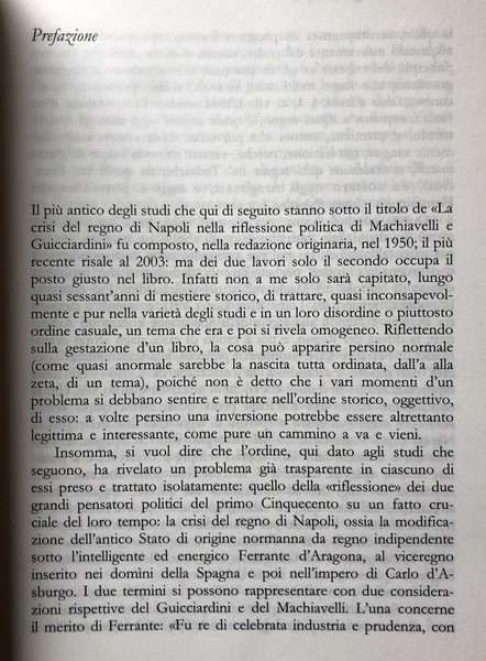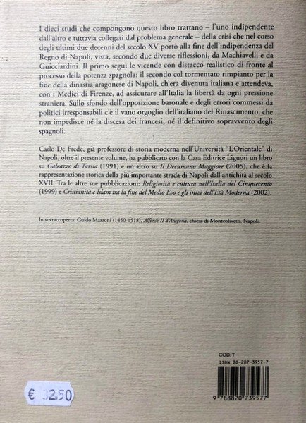 I dieci studi che compongono questo libro trattano, l'uno indipendente dall'altro e tuttavia collegati dal problema generale, della crisi che nel corso degli ultimi due decenni del secolo XV portò alla fine dell'indipendenza del Regno di Napoli, vista, secondo due diverse riflessioni, da Machiavelli e da Guicciardini. Il primo seguì le vicende con distacco realistico di fronte al processo della potenza spagnola; il secondo col tormentato rimpianto per la fine della dinastia aragonese di Napoli, ch'era divenuta italiana e attendeva, con i Medici di Firenze, ad assicurare all'Italia la libertà da ogni pressione straniera. Sullo sfondo dell'opposizione baronale e degli errori commessi da politici irresponsabili c'è il vano orgoglio dell'italiano del Rinascimento, che non impedisce né la discesa dei francesi, né il definitivo sopravvento degli spagnoli.
