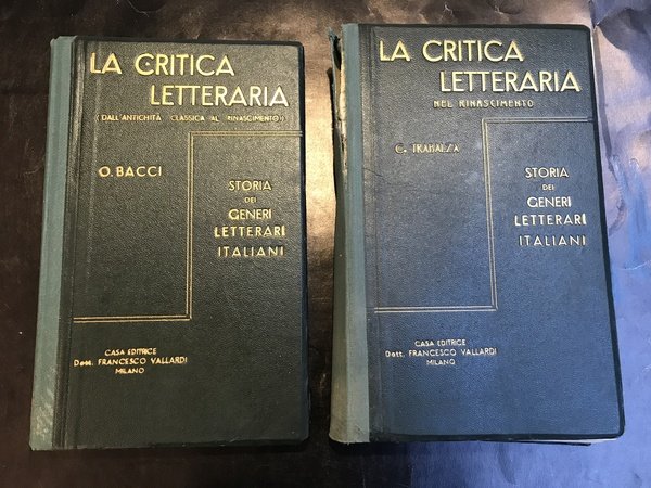 In-8°, pp. 269, legatura editoriale in mezza tela verde con titoli in oro ai dorsi e al piatto anteriore. Alla carta di guardia marca da bollo con aumento del 5% datata 25 febbraio 1940 e ed etichetta tonda dell'editore con indicato il prezzo in lire. Coll.'Storia dei generi letterari italiani'. In regalo 'la critica letteraria nel Rinascimento' con cerniera staccata