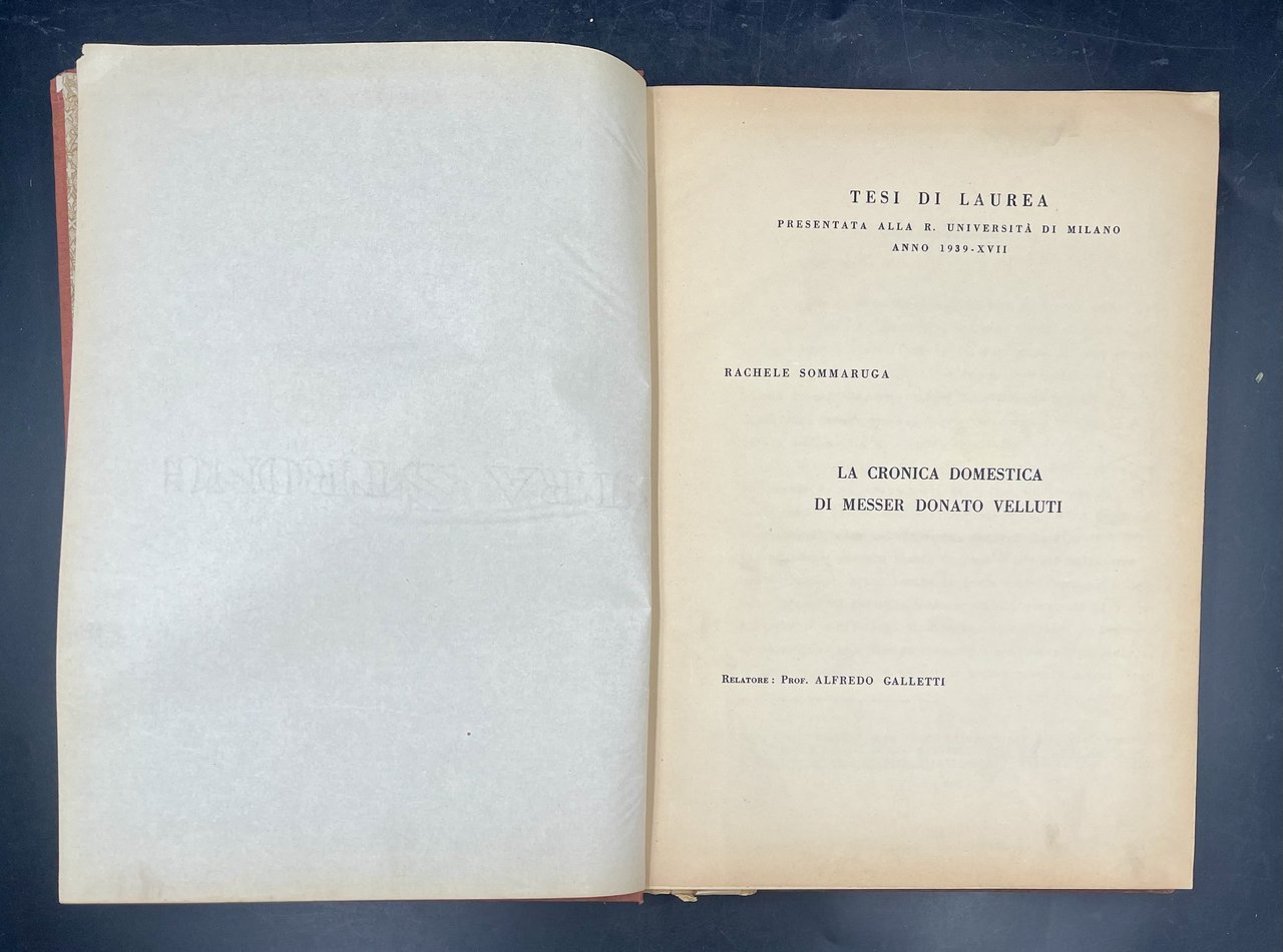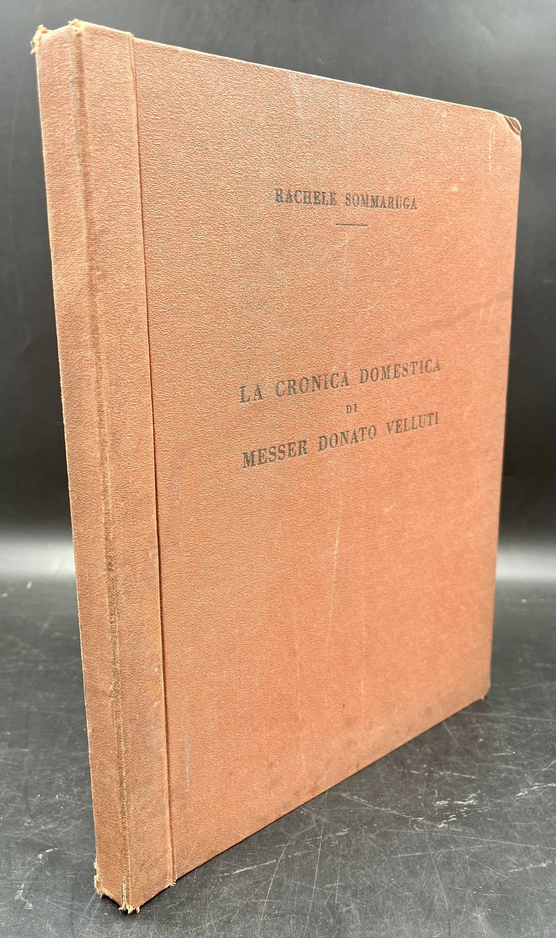 In-4° (cm. 2x20, pp. 151. Mezza tela e cartone muto originale. Testo riprodotto con carta carbone da deattioscritto. VELLUTI (Firenze 1313 - 1370), Gonfalomiere, Dal 1367 fino alla sua morte Velluti scrisse La Cronica domestica, divisa in tre parti, in cui descrive la storia della sua famiglia, che fu pubblicata una prima volta nel 1731. Nel 1914 è uscita una edizione critica a cura di Isidoro Del Lungo e Guglielmo Volpi. Ghibellino ma pragmatico e riconducibile, al senso civico e alla consapevolezza degli interessi della città nel suo insieme l contenuto delle memorie tuttavia risulta del massimo interesse storico: vi si leggono informazioni preziose su molteplici figure di notevole importanza nella Firenze del secolo che va dalla seconda metà del Duecento alla seconda metà del Trecento, oltre alle più svariate notizie di vita materiale, dalla celebre vendetta contro i Mannelli allintroduzione in città dellantenato del giuoco del tennis, a cerimonie religiose cadute in disuso, a un possibile caso di sifilide precedente ai contatti di europei con le popolazioni amerinde.