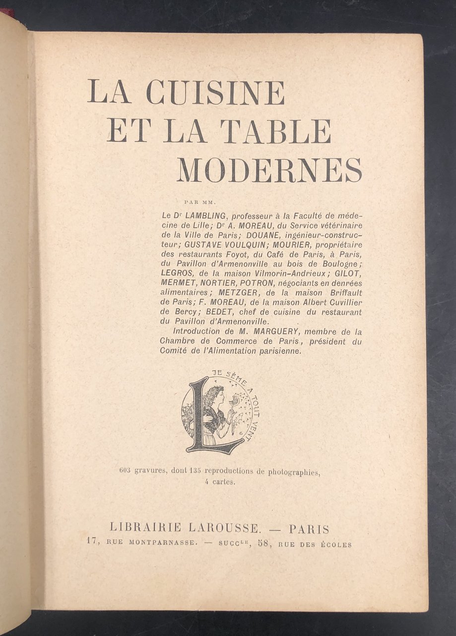 In-8° (cm. 20x14,2), pp. 489, (7) con 603 ILLUSTRAZIONI (tra cui 135 foto) e 4 carte. Bella tela granata recente, con il dorso coevo in pelle (tit. fregi oro) applicato al dorso. Tra gli Autori: Lambling, Moreau, Voulquin, Mourier, Metzger, Bedet, Douane; e i negozianti Gilot, Mermet, Nortier, Potron.