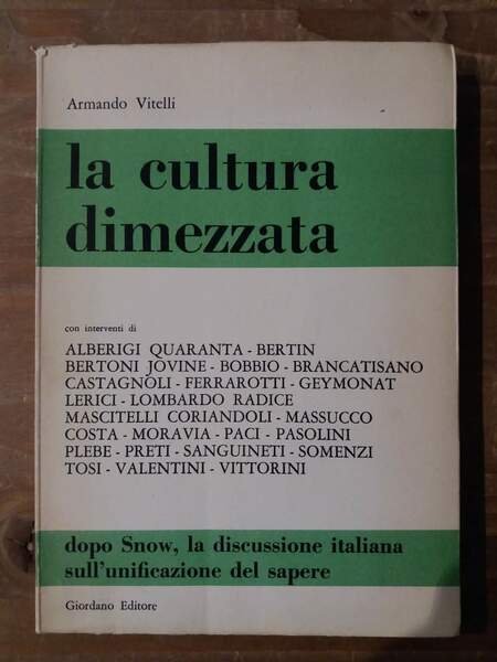 Brossura, cm. 21 x 15, pp.216. Il libro porta avanti e approfondisce il discorso che anche in Italia si è aperto dopo la traduzione del volume di Snow "Le due culture". Con interventi di Pasolini, Moravia, Vittorini, Sanguineti, Geymonat, Bobbio e molti altri.