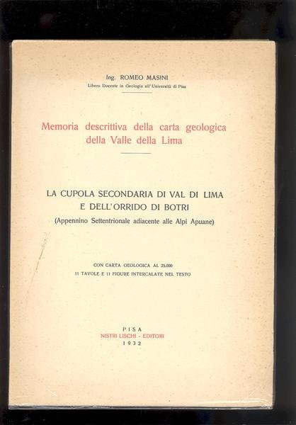 IN 8° ( cm 27 X 19,5 ),pp.114+1c.b.+ 8 TAVV.f.t.+3 tavv.+v.r. in b/n DI SEZIONI GEOLOGICHE IN SCALA 1:50000 + 1 CARTA GEOLOGICA+v.r.f.t. INSERITA IN UNA TASCA ALLA FINE<BR> DELLA VALLE DELLA LIMA E DELL'ORRIDO DI BOTRI A COLORI, IN SCALA 1: 25000.<BR> E' PARTE DEL FOGLIO 97 DELLA CARTA D'ITALIA DELL'ISTITUTO GEOGRAFICO<BR>MILITARE. COPERTINA EDITORIALE CON TITOLO in r./n. MEMORIA DESCRITTIVA DELLA CARTA <BR>GEOLOGICA DELLA VALLE DELLA LIMA. INTONSO, STATO NUOVO. ID 1093