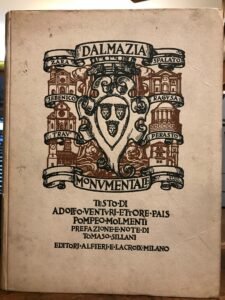 Con 100 tavole fuori testo in b/n raccolte e annotate da Tomaso Sillani: Arbe, Zara, Sebenico, le Bocche di Cattaro, Curzola, Traù, Perasto, Spalato, Ragusa, Salona, Lesina, ecc. Lievi fioriture alle sguardie, normale brunitura della carta, ordinari segni dell'uso, nel complesso molto buono. Pagg. 82,1 nn, più le tavole. Cartonato rigido ill. a col. Mis mm 280x210