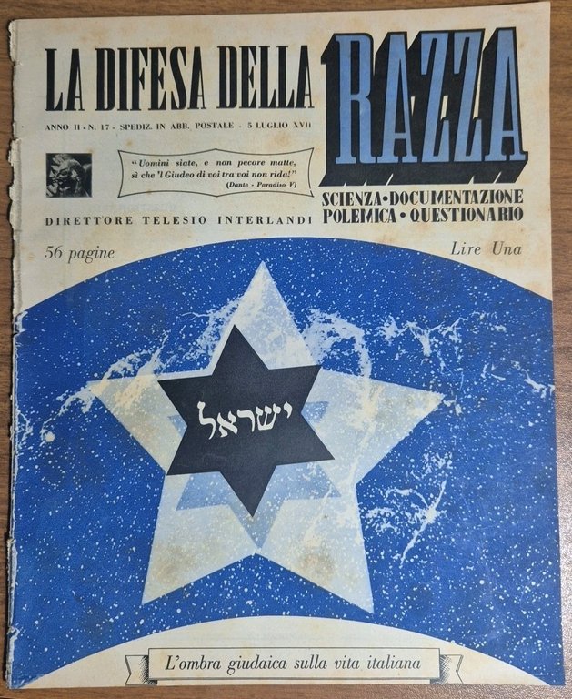 LA DIFESA DELLA RAZZA anno II numero 17 del 5 luglio 1939. L'ombra giudaica sulla vita italiana.