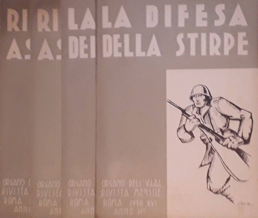 Raccolta incompleta, anno 1938, della rassegna mensile giuridico-sociale organo dell'U.I.A.I. (Direttore: Giacondo De Simone) dapprima denominata "La difesa della stirpe" e poi divenuta "Rivista della Assostenza", disponibili i N. 5-6-9-10, coperte leggermente imbrunite, tagli e pagine con imbrunitura, testi completamente fruibili, con illustrazioni in bianco e nero, numero complessivo pagine 204 [volume I] "La difesa della stirpe", N. 5: "Maggio", numero pagine 51 [volume II] "La difesa della stirpe", N. 6: "Giugno", numero pagine 51 [volume III] "Rivista della Assistenza" (già "La difesa della stirpe), N. 9: "Settembre", numero pagine 55 [volume IV] "Rivista della Assistenza" (già "La difesa della stirpe), N. 10: "Ottobre", numero pagine 47