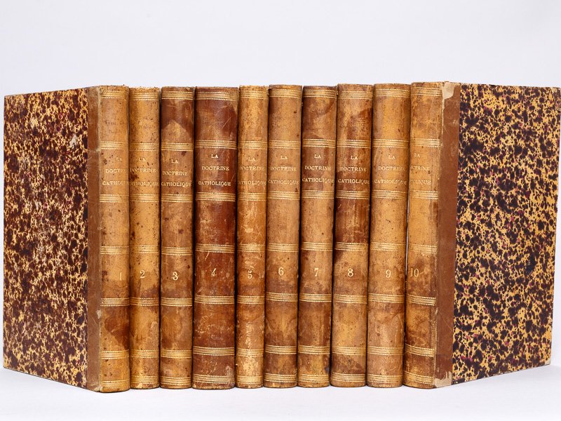 10 vol. in-8 reliure demi-basane marron, Nouvelle Librairie Catholique, Victor Sarlit, Paris, 1858-1863. Rappel du titre complet : La Doctrine Catholique expliquée ou Recueil hebdomadaire de prones, homélies, sermons et instructions pour toutes les époques de l'année chrétienne (10 Tomes) Tomes 1 et 2 : 1re anne?e, Avent 1858 et 1859, Dominicales et sujets de circonstance ; Tome 3 : Volume supple?mentaire : Double anne?e pastorale. Home?lie sur les e?vangiles de tous les dimanches de l'anne?e par M. Granet cure? archipre?tre de Se?deron ; Tomes 4 et 5 : Instructions sur les sacrements, pane?gyriques, etc. ; Tome 6 : Instructions sur les fê?tes du rit romain, sous la direction de M. l'abbe? J. Higounenc ; Tome 7 : Instructions pratiques sur le symbole, par M. l'abbe? J. Higounenc ; Tome 8 : Instructions simples et pratiques sur les commandements de Dieu et de l'Eglise par M. l'abbe? Clairin ; Tome 9 : Imitation des saints. Recueil d'instructions courtes, simples, pratiques sur la vie et les vertus des saints les plus populaires suivant l'ordre de la liturgie romaine par M. l'abbe? Ag. Sabatier ; Tome 10 : Instructions simples et pratiques sur les vertus the?ologales, la vertu de Religion et les Vertus Cardinales par M. l'abbé Clairin Rare série quasi-complète (un tome 11 : Instructions simples et pratiques sur la gra?ce et les sacrements, par M. l'abbe? Clairin, paraîtra en 1864). Etat très satisfaisant (dos frottés, bon état par ailleurs).