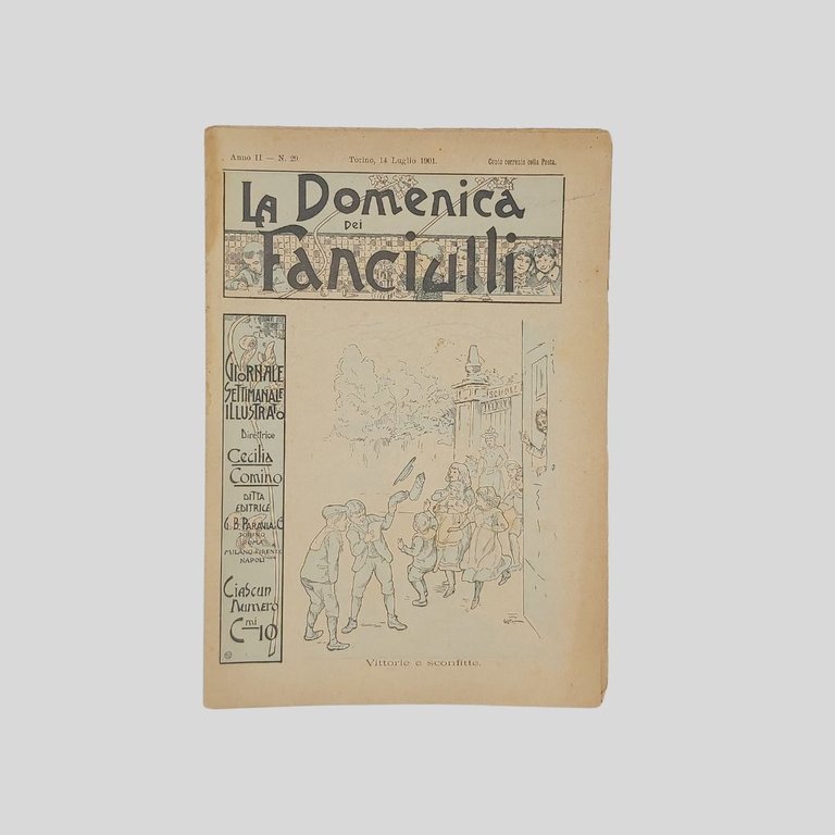 anno II, n. 29, 14 Luglio 1901, cm 27×19, pp. 16 (numeraz. continua). Dir. Cecilia Comino. Illustrazioni in bianco e nero e a colori, nel testo e fuori testo e pagine di pubblicità. Testata di GIB. Cop. a colori di Gech. In buone condizioni. Non comune come tutti i fascicoli del primo e secondo anno. La domenica dei Fanciulli con la testata dalla grafica di gusto liberty e con le innovative copertine costituì uno dei più felici esempi dell’Art Nouveau. Esso dirà ai più piccoli, come ai più grandicelli, tante cosette utili a sapersi ritrarrà scene della vostra vita quotidiana in casa ed in iscuola; vi proporrà giuochi istruttivi, lavoretti geniali; vi narrerà graziose storielle; vi presenterà, come in una lanterna magica, quadri curiosi ed attraenti sui più svariati soggetti. Con l’inizio del ‘900 si vedono ridursi sempre di più le distanze tra artisti e illustratori e avviarsi una capillare diffusione delle riviste stampate con moderni procedimenti fotolitografici. È il caso del settimanale La domenica dei fanciulli, pubblicato a Torino dal 1900 al 1920, un nuovo “giornale settimanale illustrato” per bambini che andava ad affiancarsi ad altre prestigiose testate come Il Giornalino della domenica e Il Corriere dei piccoli e che proseguì le pubblicazioni per un ventennio. Edita da Paravia, fu diretta prima da Cecilia Comino e poi da Luisa Arietti. Tra i collaboratori: Teresa Corrado, T. Gironi, L. Sclaverano, E. Nuccio. Tra gli illustratori: Attilio (Attilio Mussino), Adalbert Begas, Gaido e Giulio Brugo, G. G. Bruno, F. Calmettes, Carlucci, Quinto Cenni, Gech (G. E. Chiarino), Zier (R. de La Neziére), Ch. Parc, L. Pansa.