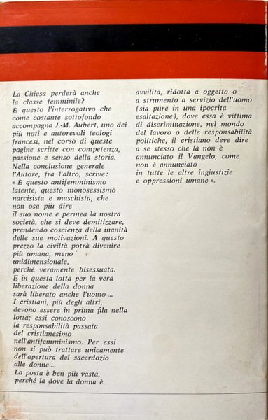 francesi, nel corso di queste pagine scritte con competenza, passione e senso della storia. Nella conclusione generale l'Autore, fra l'altro, scrive: «È questo antifemminismo latente, questo monosessismo narcisista e maschilista, che non osa più dire il suo nome e permea la nostra società, che si deve demitizzare, comprendendo coscienza della inanità delle sue motivazioni. A questo prezzo la civiltà potrà divenire più umana, meno unidimensionale, perché veramente bisessuata. E in questa lotta per la vera liberazione della donna sarà liberato anche l'uomo. I cristiani, più degli altri, devono essere in prima fila nella lotta; essi conoscono la responsabilità passata del cristianesimo nell'antifemminismo. Per essi non si può trattare unicamente dell'apertura del sacerdozio alle donne. La posta è ben più vasta, perché laddove la donna è avvilita, ridotta a oggetto o a strumento a servizio dell'uomo (sia pure in una ipocrita esaltazione), dove essa è vittima di discriminazione, (nel mondo del lavoro o delle responsabilità politiche, il cristiano deve dire a se stesso che là non è annunciato il Vangelo, come non è annunciato in tutte le altre ingiustizie e oppressioni umane».